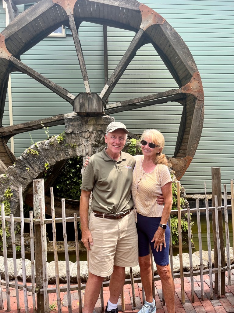 We sat down at tables in front of this wagon wheel to eat our soft serve ice cream. People walking by would stop and ask us to take their photos. Finally we had someone take ours.