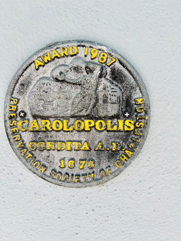 You will see the award affixed to structures throughout the Historic District, the French Quarter, and beyond. It is a circular plaque mingling English and Latin around an engraving resembling the City of Charleston seal. The image reflects the city’s motto: Aedes mores juraque curat which means “She guards her buildings, customs, and laws.” This comes form the Latin Carolus for “Charles” – that’s King Charles, for whom Carolina is named, and the Greek polis meaning city.