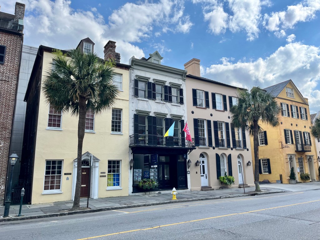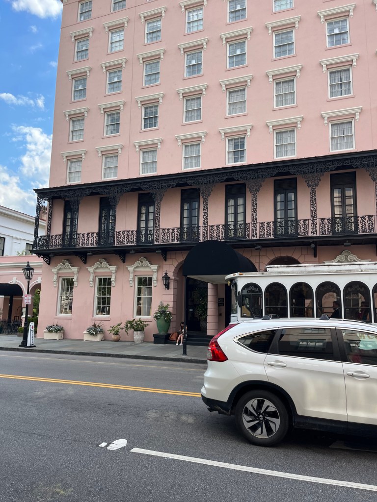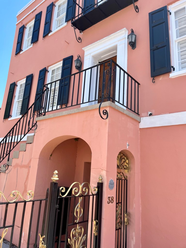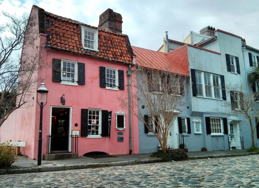 The structure’s pink exterior, original gambrel tiled roof and cobblestone road capture several iconic staples of Charleston.