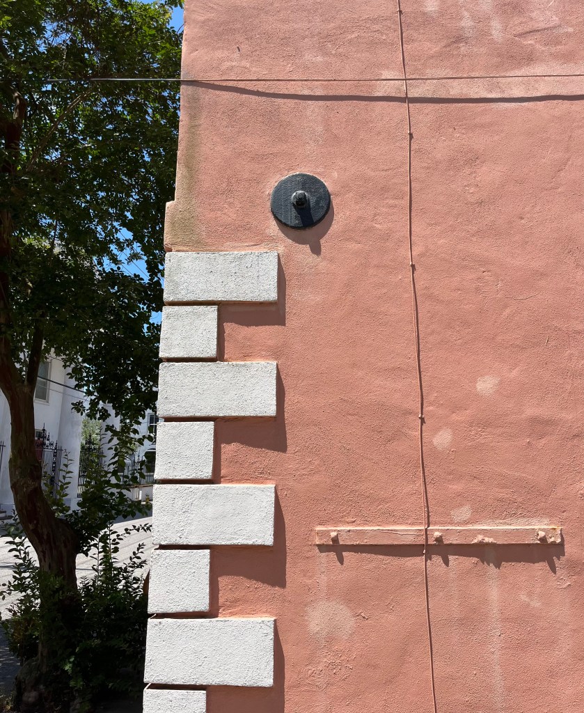 The plates are visible on the outside wall. Some are crafted as decorative elements, such as crosses, circular scrolls or stars.