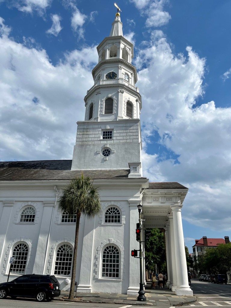 St. Michael’s is the oldest surviving religious building. The current church was build in the 1750s. It sits on the corners of Meeting and Broad Street. This intersection is often referred to as the “Four Corners of Law” as on each corner there is a building that represents federal, state, local and religious law: the U.S. Post office, the Federal Courthouse, the Charleston County Courthouse, Charleston City Hall and St. Michael’s.