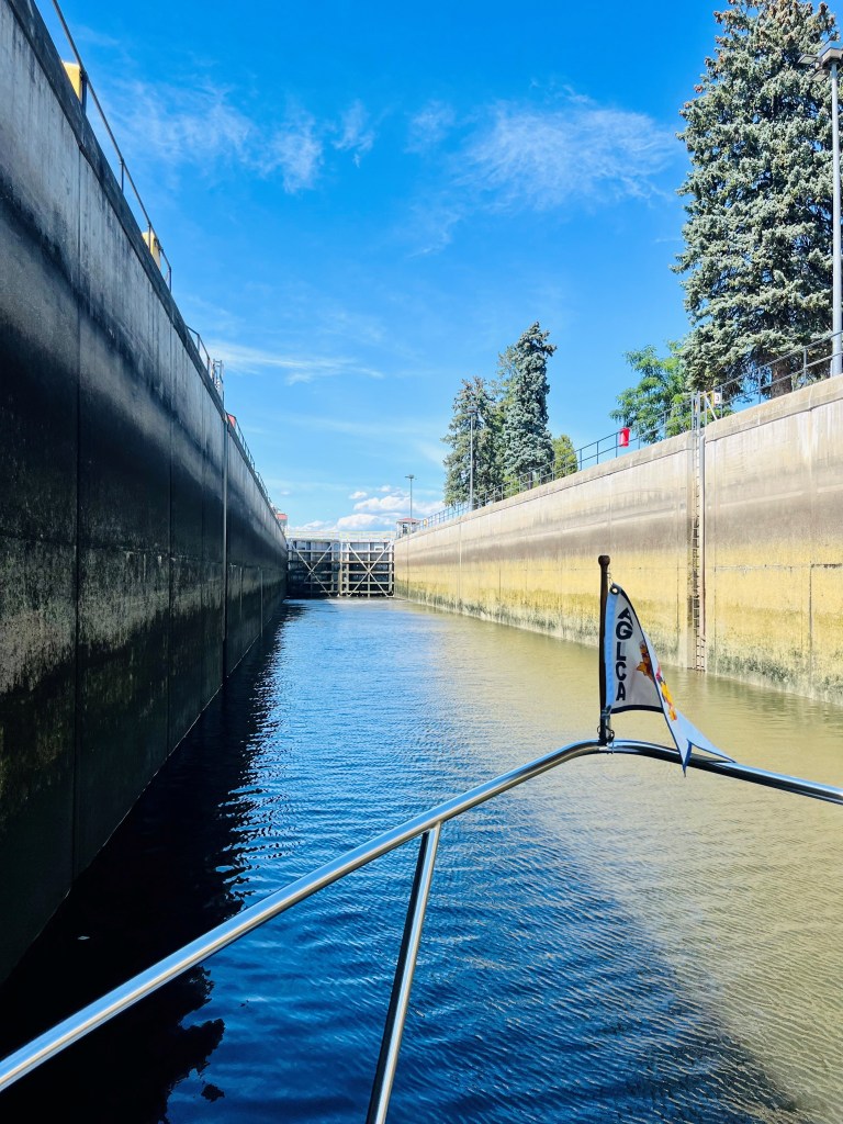 When entering the lock, you will place your boat along the wall – either starboard or port – sometimes the lockmaster will specify one side. You stop the boat and hold onto the lines that drop from the top.