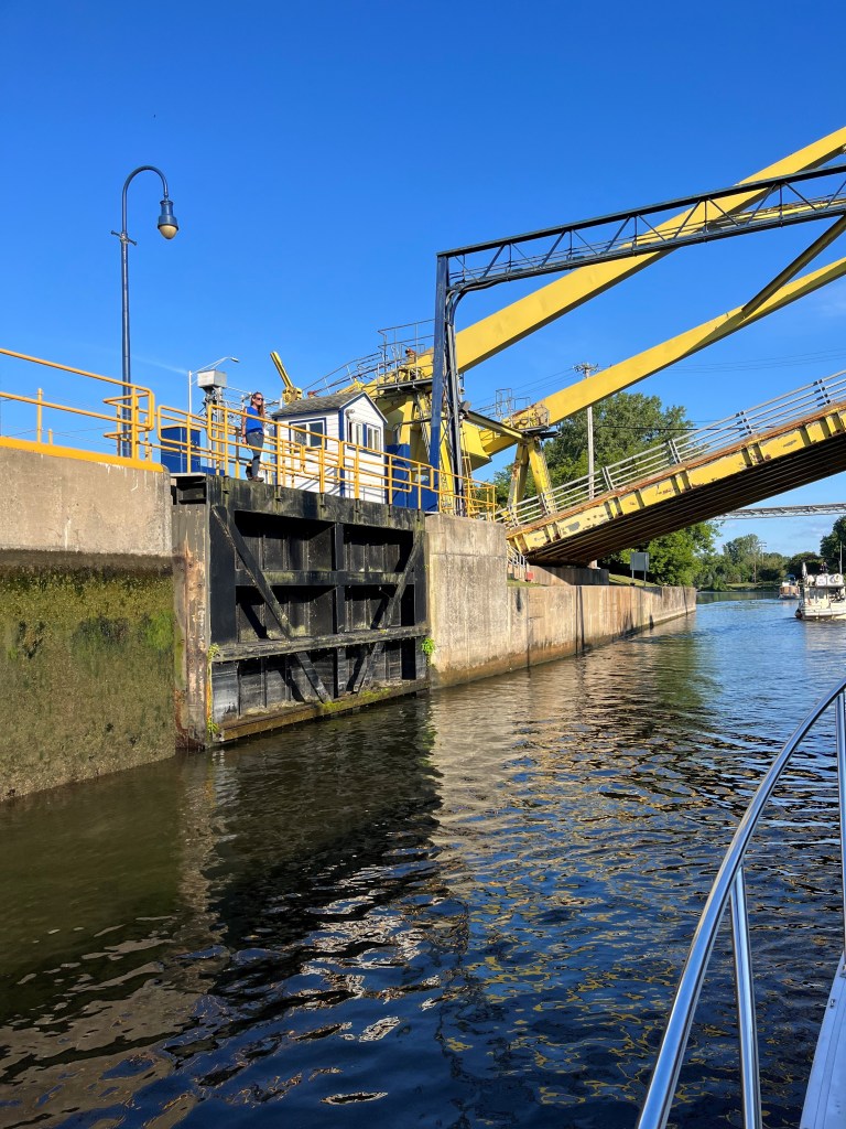 Phoenix was the last stop on the Erie. The next morning we entered Oswego Lock 1, a short distance from Phoenix. This lock had a drawbridge as well. We had another early departure, and weren’t quite ready when the first boat left, so we were scrambling to unhook the electrical and water and get to the lock with the other boats.