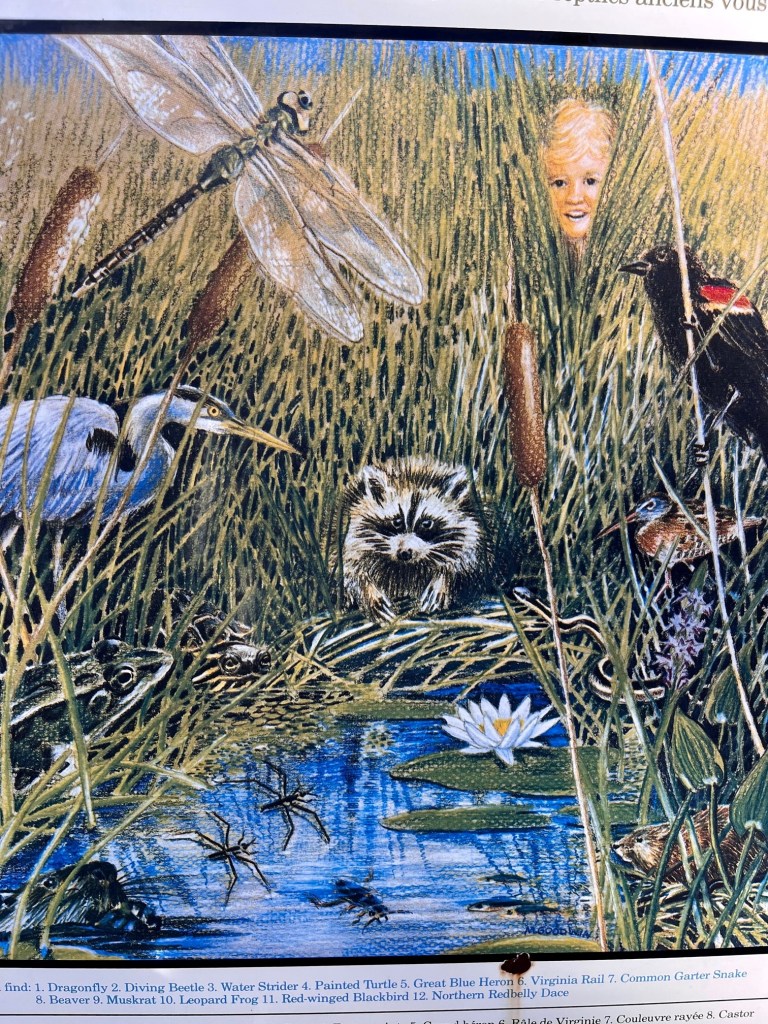 Huge painting where children can look for all types of wildlife of the marsh – dragonfly, beaver, muskrat, painted turtle, garter snake, etc.