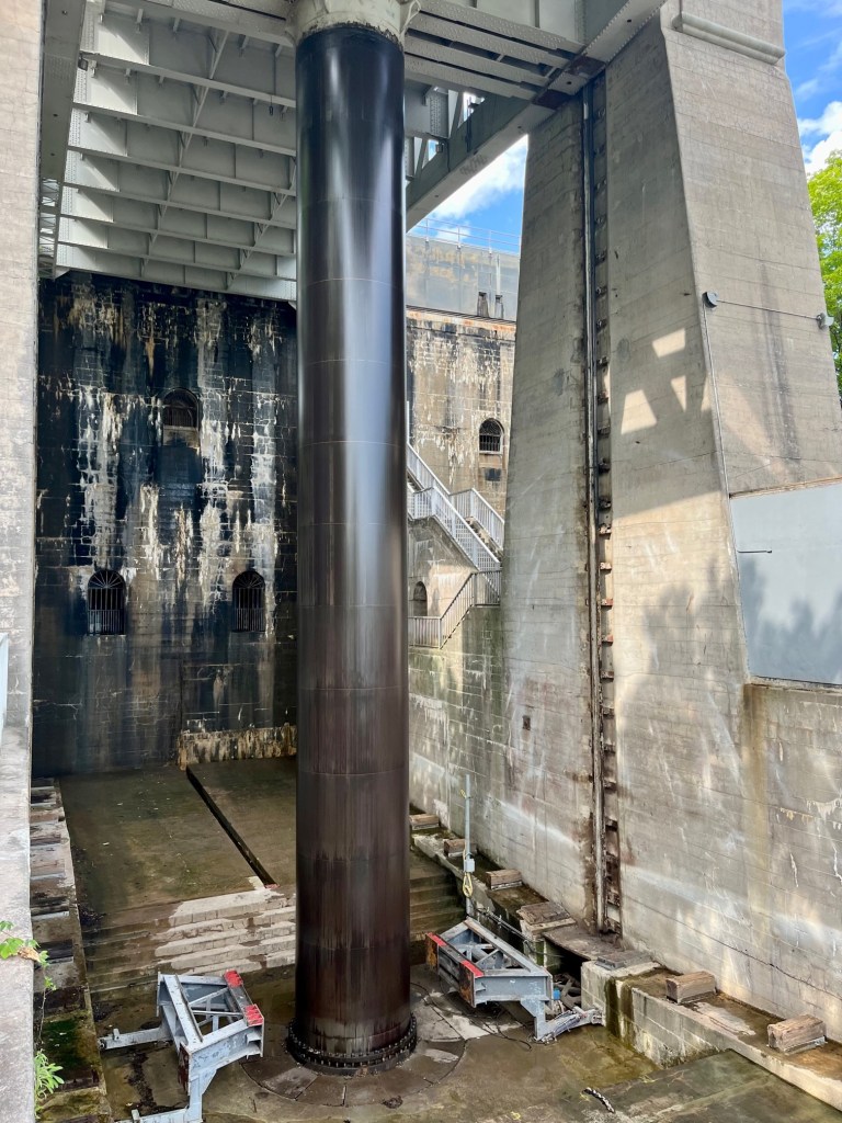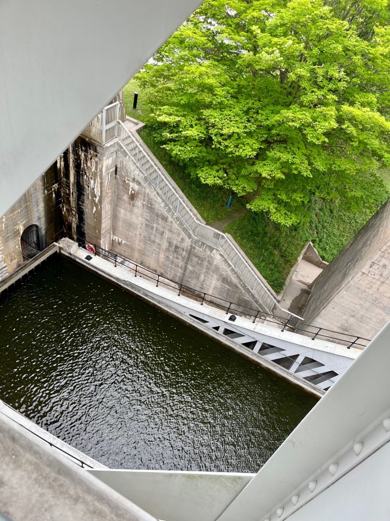 As you approach the lift lock from the lower level a gate opens in the lower chamber allowing you to enter. Several boats can be accommodated at one time. After all boats have entered and tied up to the side walls, the gate is closed. Then an additional foot of water is added to the upper chamber making it heavier by 130 tons. A valve is then opened to connect the hydraulic rams together and the heavier upper level descends forcing the lower chamber up 65 feet to the upper level. Then the gate is opened at the upper level of the waterway and you continue on. Amazing!