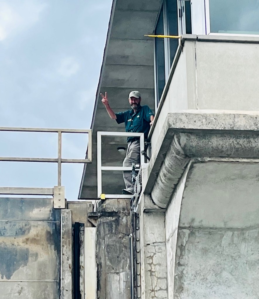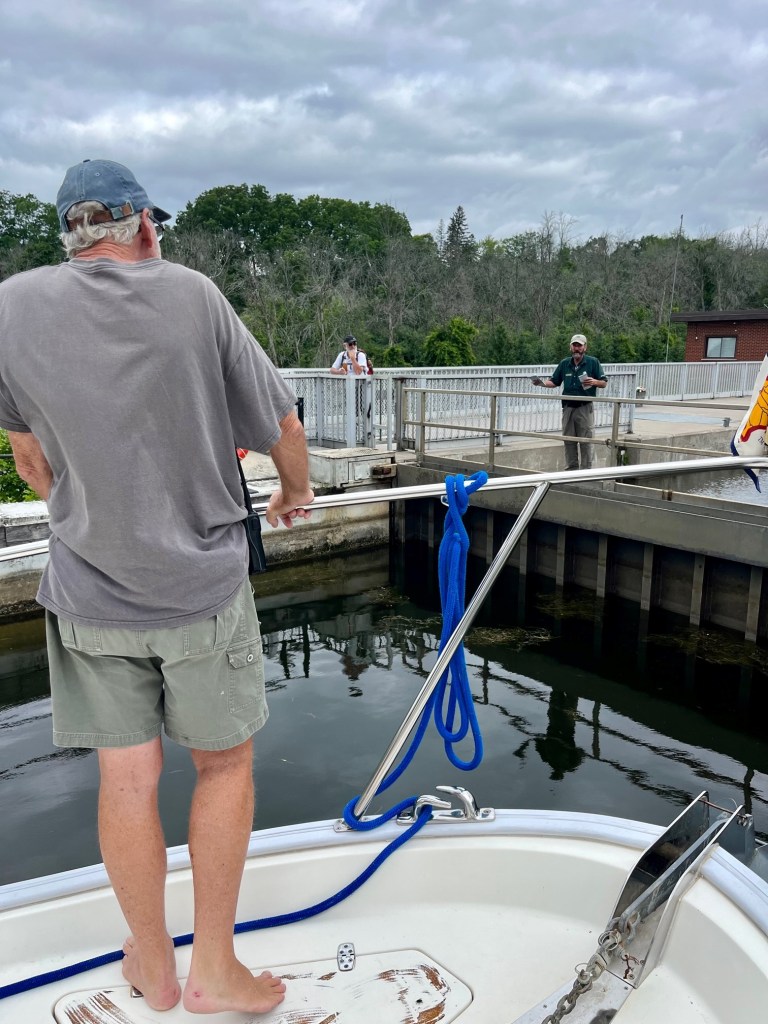 Patrick chatting with the Lockmaster (he does this at every Lock -:) ) This Lockmaster was exceptionally friendly. He even gave us information about the lock and a souvenir pin.