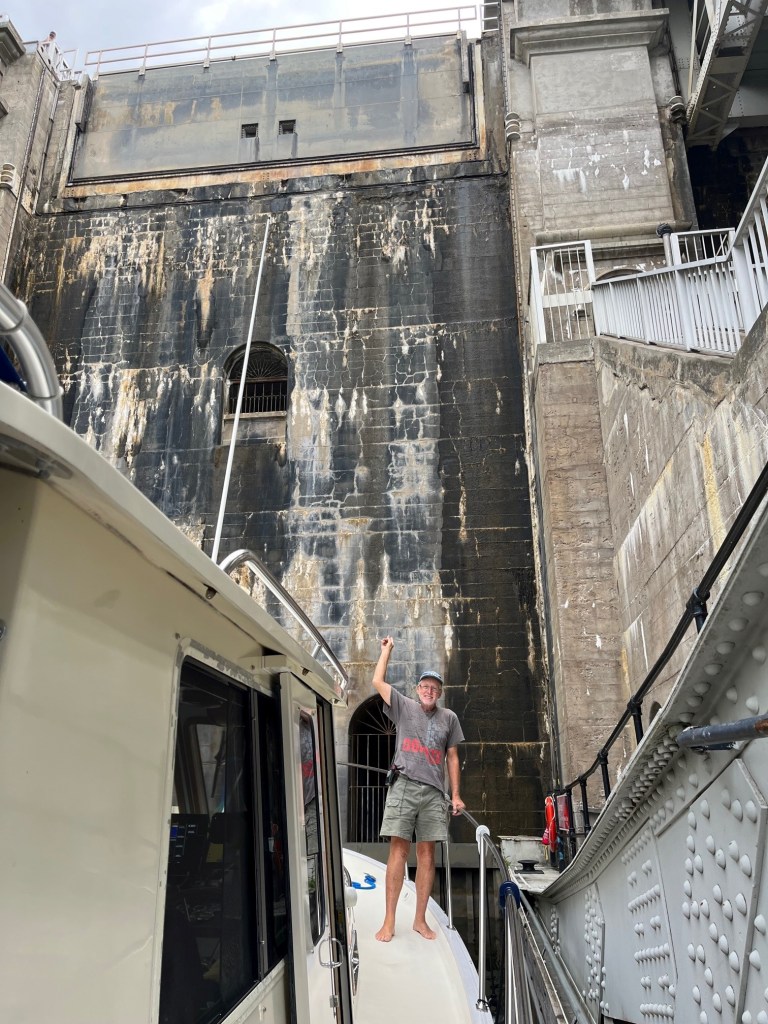Captain Pat in the Peterborough Lift Lock – we are going way up!