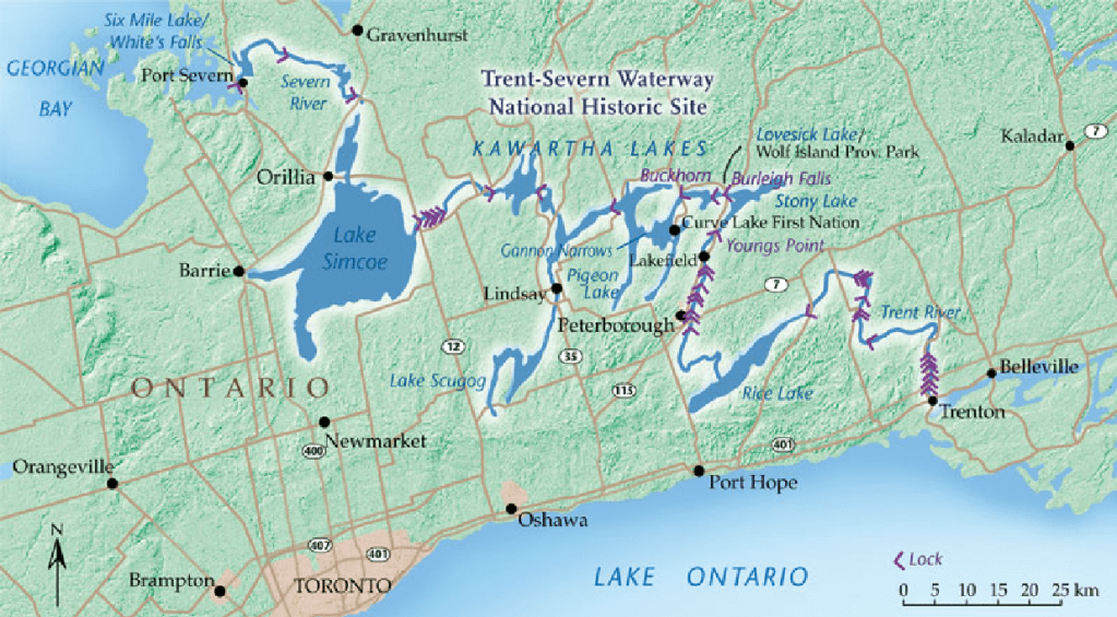 In the upper left you will see Georgian Bay – our destination. In the lower right is Trenton, where we began the Trent-Severn Waterway, on Lake Ontario. You will also see Toronto toward the bottom left. At the top is Kawartha Lakes, the historic region we’ve referred to. In the middle of the map are Peterborough, Pigeon Lake, Lakefield, Stony Lake and Lovesick Lake.