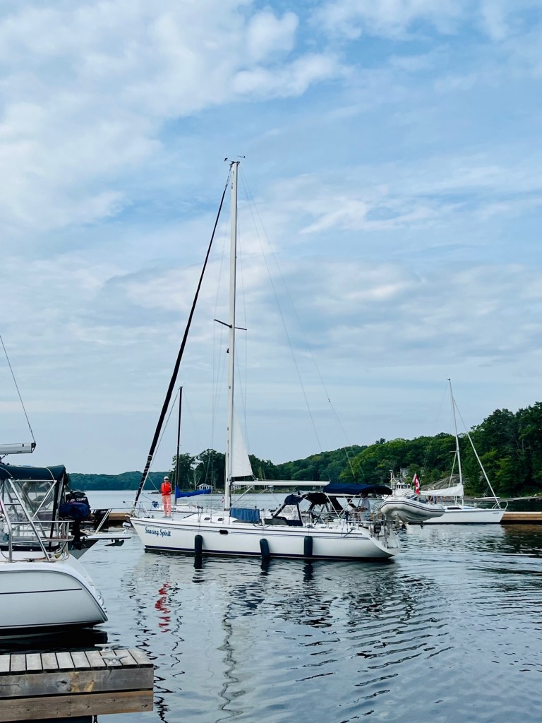 We met many local boaters as this marina is their home port. For these local boaters, this is their weekend getaway. They stay on their boats like staying in a cottage, and the docks are common ground to meet and greet. They barbecue at the grills, take short boat rides, lounge on the grounds reading books, and visit the town. They are curious about “Loopers!” Saturday we were pleasantly surprised as Laurie and Ray (they took us to Costco in Penetang!) showed up with another couple. It was great to see them again.