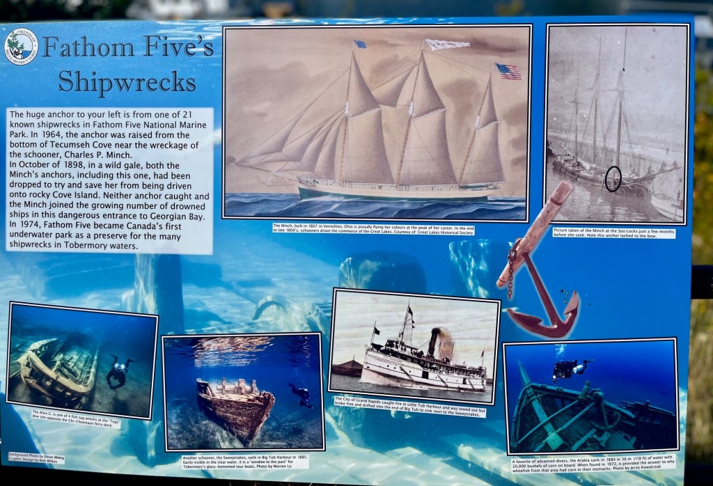 In 1964 an anchor was raised from the bottom of Tecumseh Cove near the wreckage of the schooner, Charles P. Minch. That anchor is displayed in the town and pictured below.