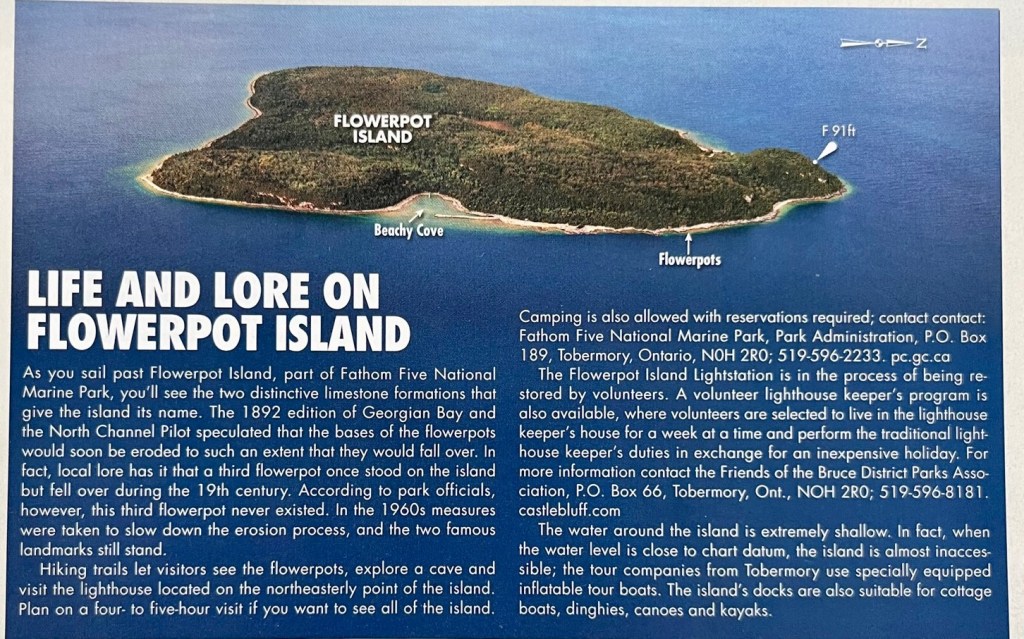 Many of the Tobermory islands and shoals are part of the Fathom Five National Marine Park, Canada’s first national marine park. Hazardous for unwary cruisers, they are a magnet for scuba divers, who come to the area for its great visibility (30 to 40 feet) and the many shipwrecks of vessels that fell victim to those islands and shoals. The park has 21 known shipwrecks and is home to 140 species of fish!
