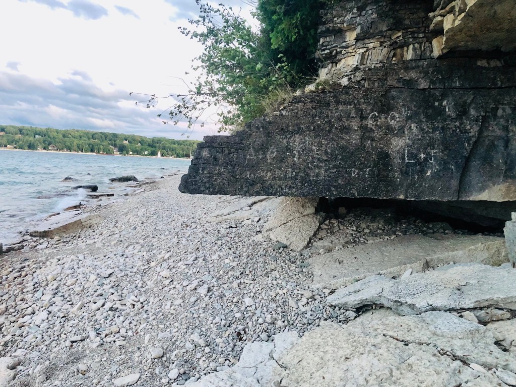 The lion-shaped overhanging limestone bluff (part of the Niagara Escarpment) from which the town takes it name is about 1 1/2 miles to the northeast. It once looked like a prone lion; however, the rocky nose of the feline has fallen off since the resemblance was first noticed. The scenic limestone cliffs, with a backdrop of coniferous forest for which the peninsula is famous, stretch from the head into town.