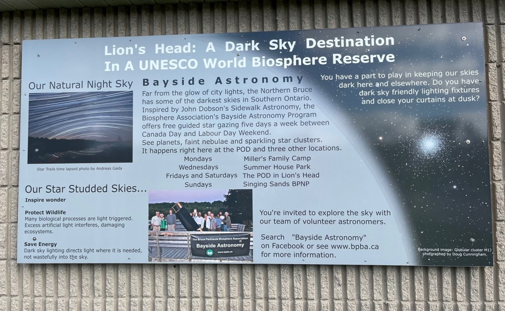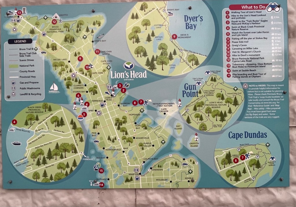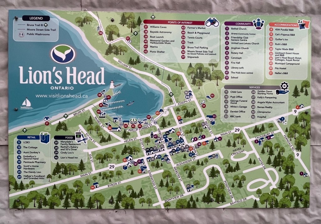 Lion’s Head is a quiet, pretty little village (population 597) on the shore of the Bruce Peninsula, about 16 miles south of Cabot Head. Its location on the 45th parallel puts it halfway between the equator and the North Pole.