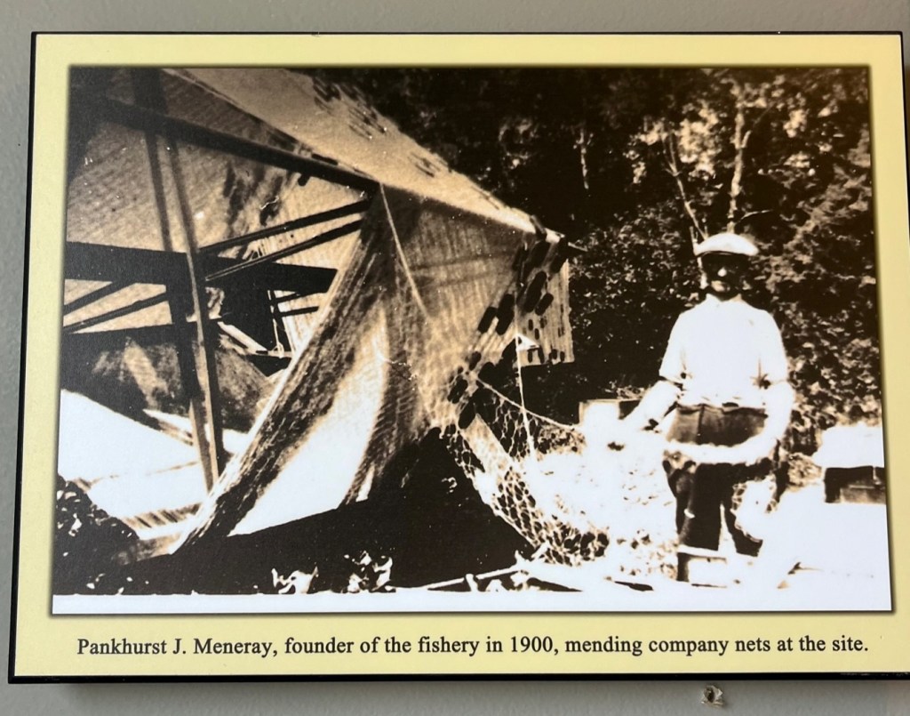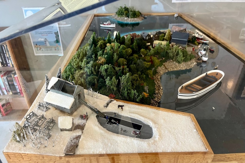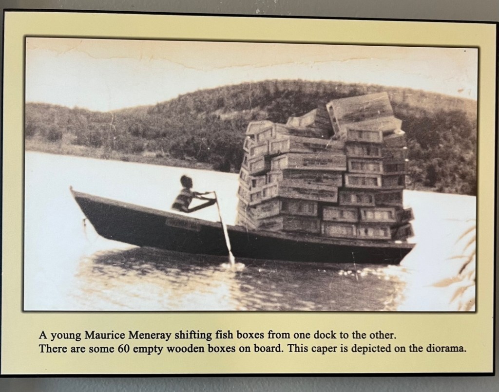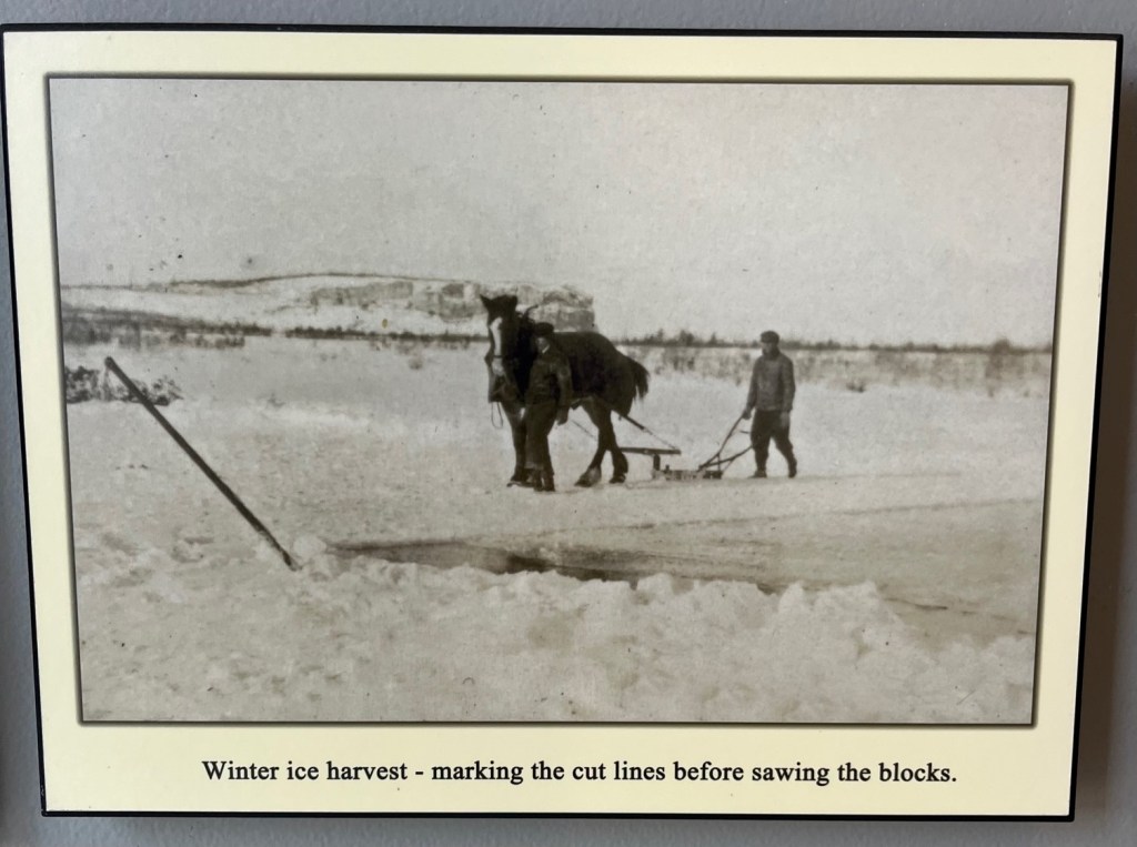 Inside the marina is a diorama that shows a replication of the “ice harvest.” Each winter during the life of the Meneray Fishery at Wingfield Basin, crews traveled to the basin and harvested ice, putting it up in the adjacent ice-houses, packed in sawdust. This provided enough ice for crushing and packing the catches throughout the following season. Their own “ice making” machines!