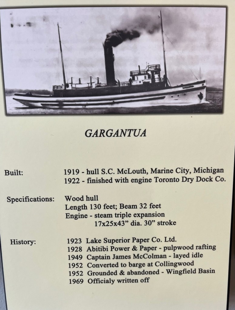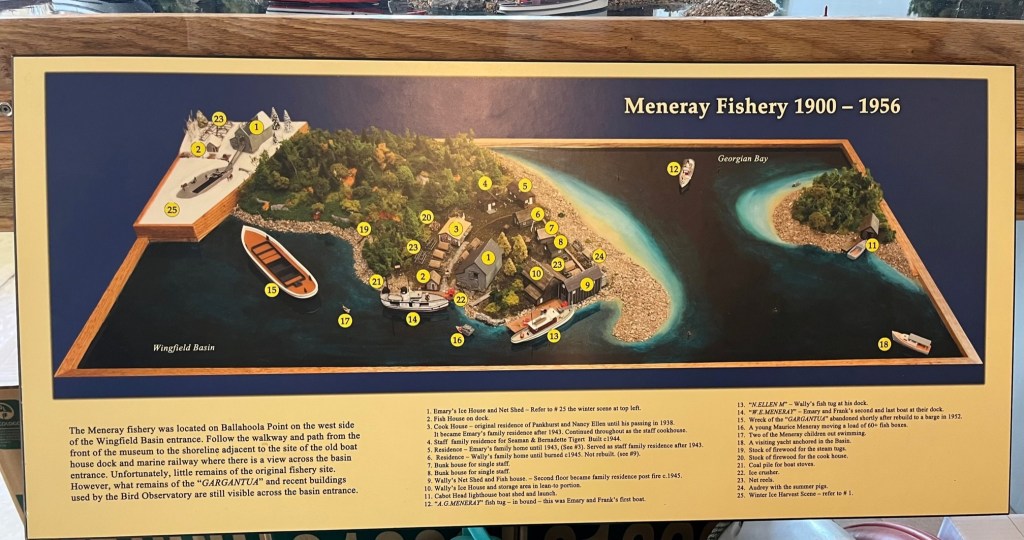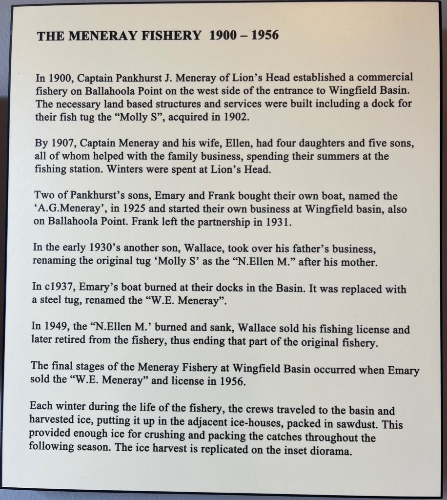 Do you remember in a previous post we mentioned a shipwreck – the Gargantua – in the Wingfield Basin? In the marina office at Lion’s Head is a wall tribute featuring photos and the history of the Meneray family, who established a commercial fishery in Wingfield Basin and wintered in Lion’s head.