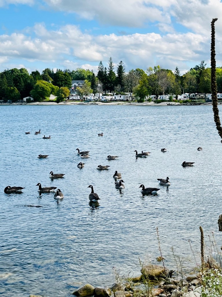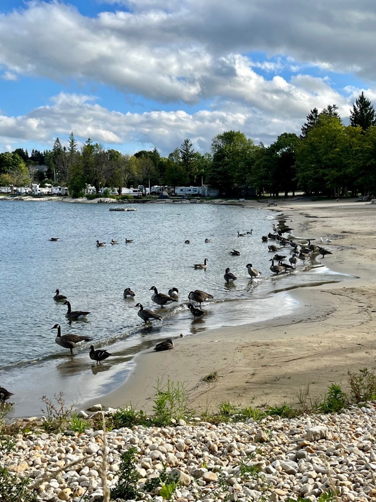 The weather turned chilly (50 degrees) and windy, causing the geese to congregate in water and along the beaches. Guess the planting beds didn’t do much!