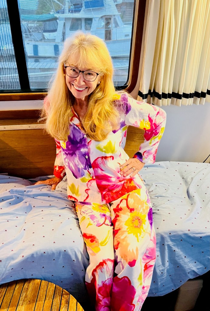 The Admiral finds her favorite pajamas left on the boat! Thank you, Angela Solomon!