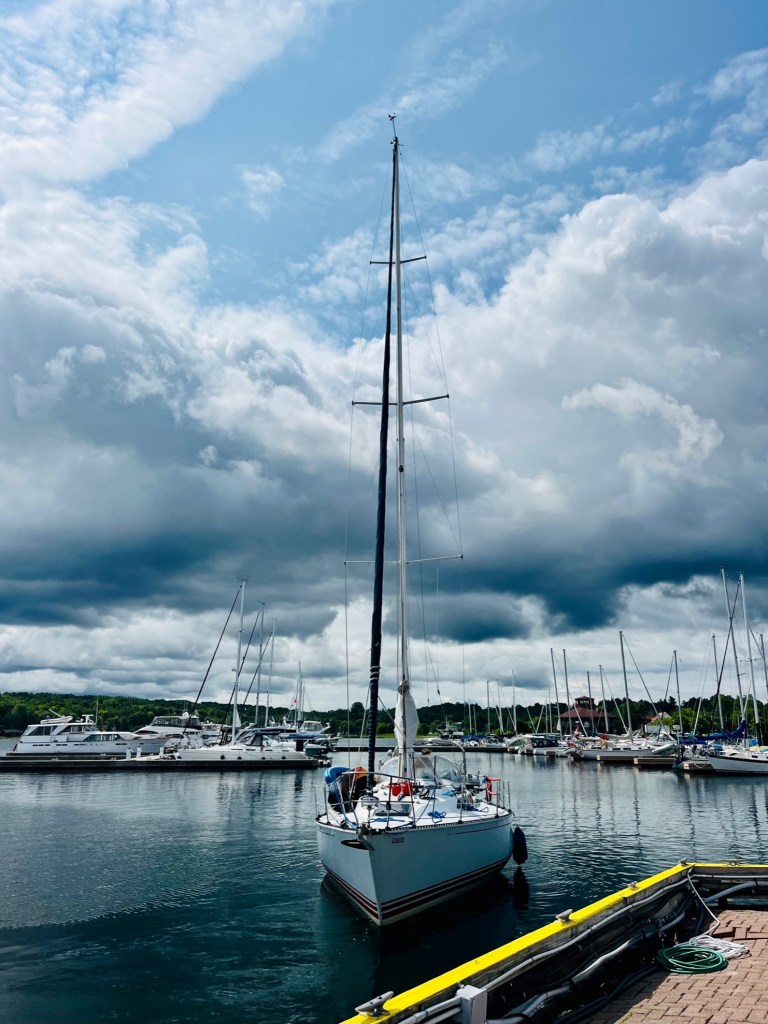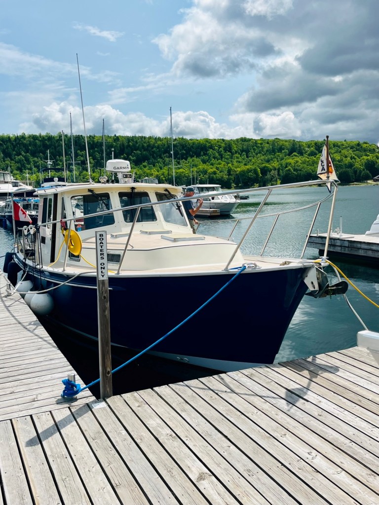 Captain Pat discovers he needs to replace the 12 volt DC (direct current) to DC chargers to the lithium batteries. Steve, a mechanic from Harbour West Marine, drives 4 ½ hours from Penetanguishene to our boat in Gore Bay. He replaces the chargers and confirms that one of our starting batteries is not working. That will require a replacement, probably at Drummond Island in the States. We appreciate Steve taking the time to make this repair.