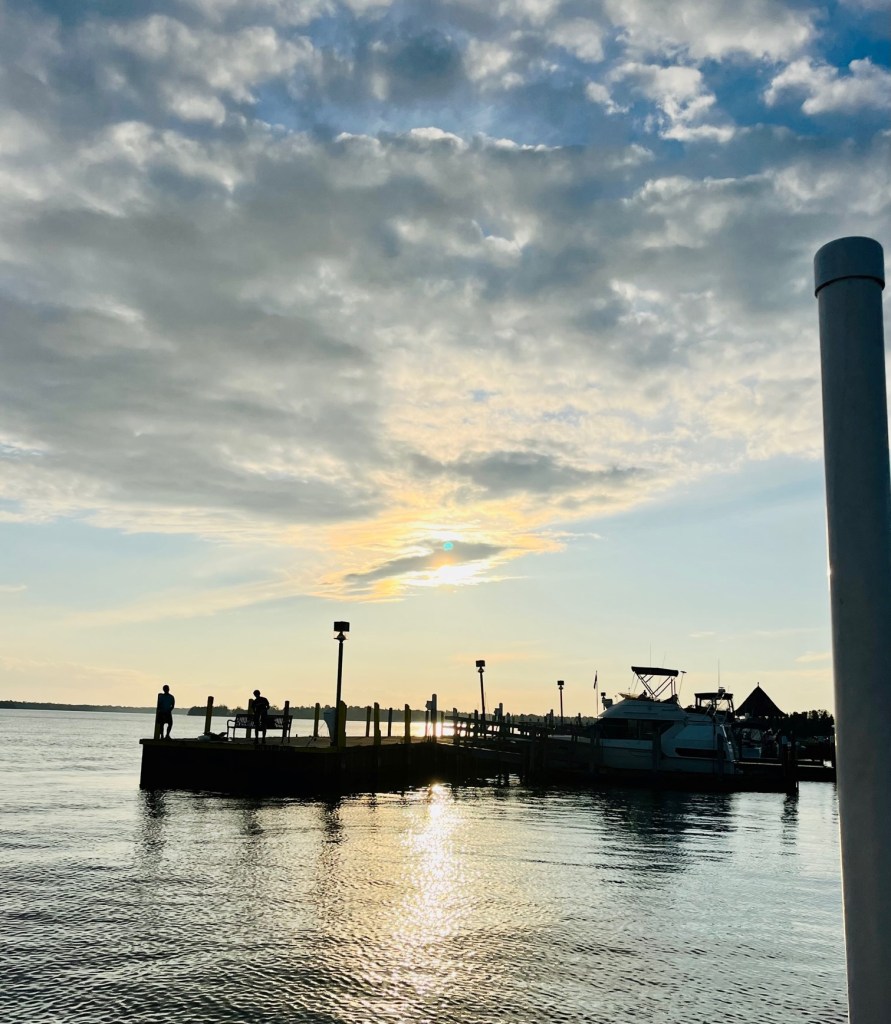 Later that night, after the show ends, we take Sunshine back to her slip at the marina. We underestimate the winds. Thank goodness two men on the dock see our plight and come to help us secure her. That was a harrowing experience!