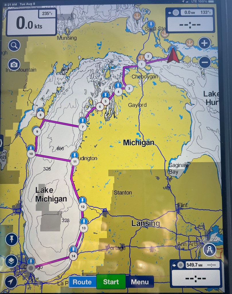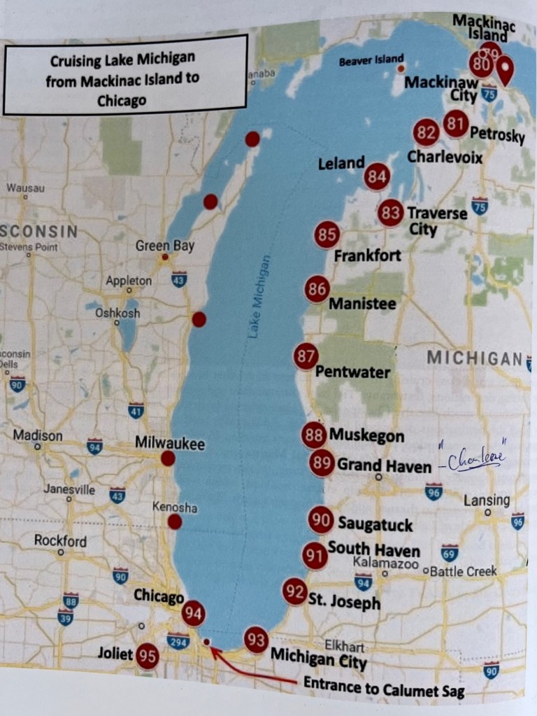 Captain Patrick charted our stops for our journey along the west coast of Lake Michigan (the east coast of the state of Michigan.) This will take us into Chicago.