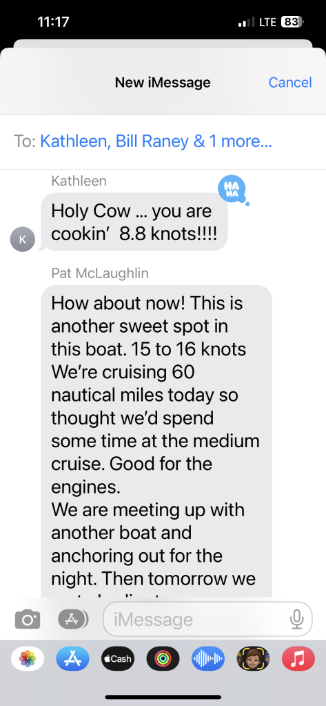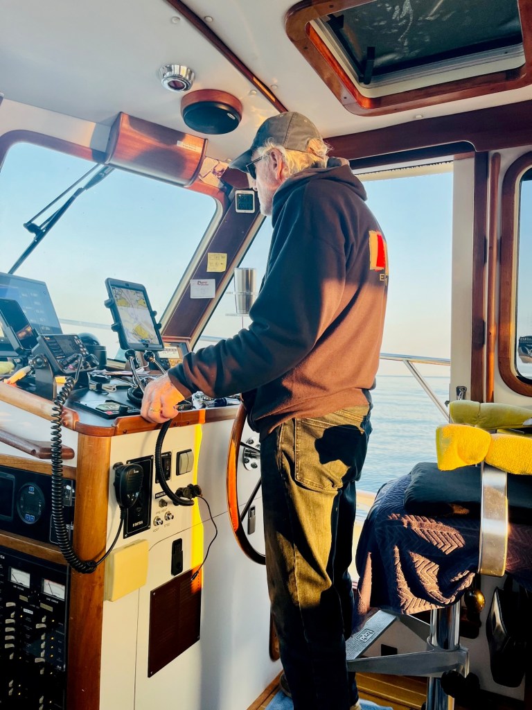 The wind is at our back and Captain Pat steps up the speed (and the fuel usage!) This is our longest voyage for this year, at almost 80 miles.