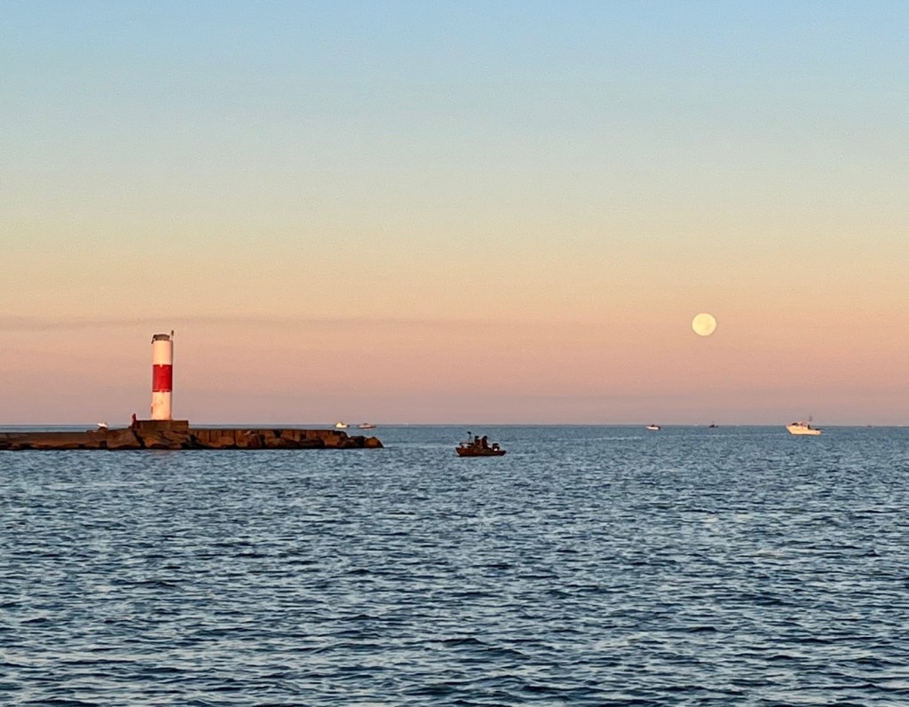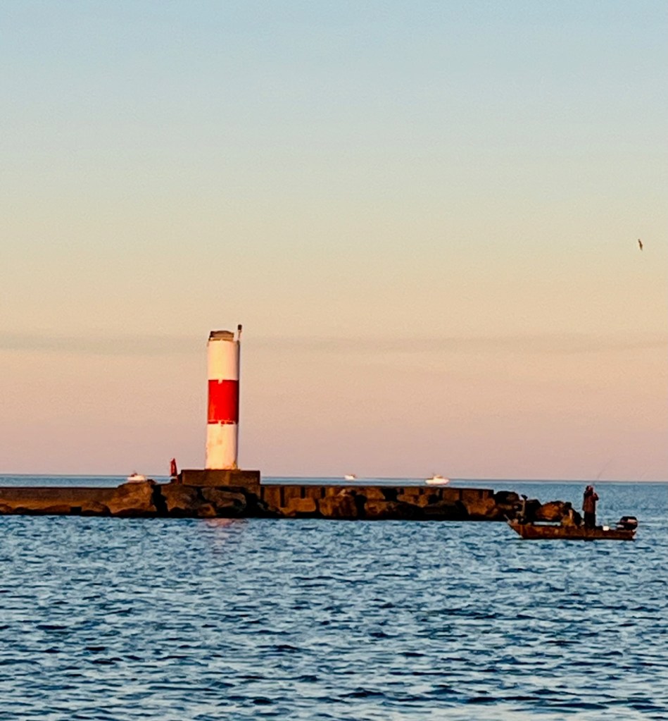 Captain Pat and I walk one windy afternoon to the breakwall by the beach, to see the lighthouse.