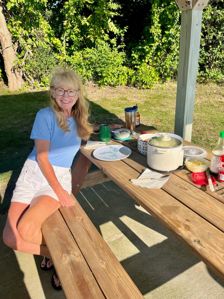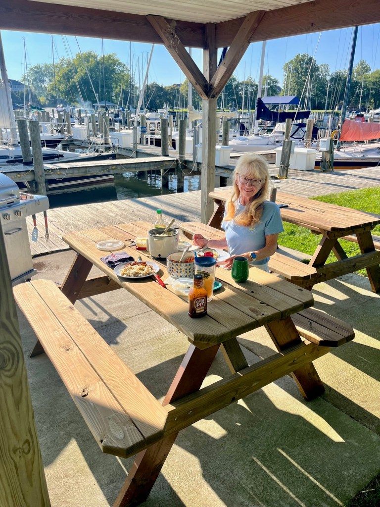 We dine al fresca on the wooden picnic table by the grill. Such a pleasant evening and the perfect way to say goodbye to West Basin Marina.