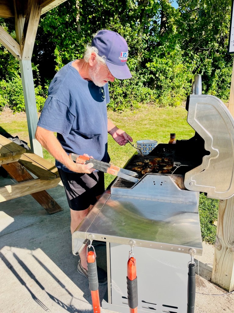 On our last evening Captain Pat treats the Admiral by making dinner on the grill. He makes the best barbecued chicken. This reminds me of dinners at our lake cabin.