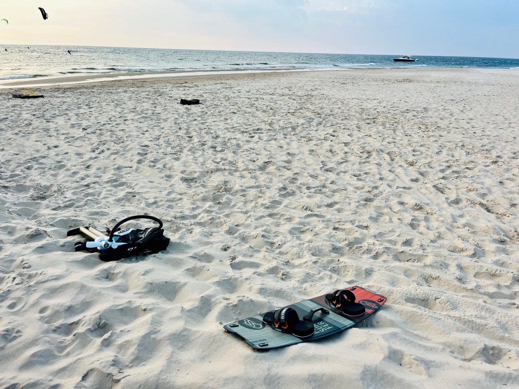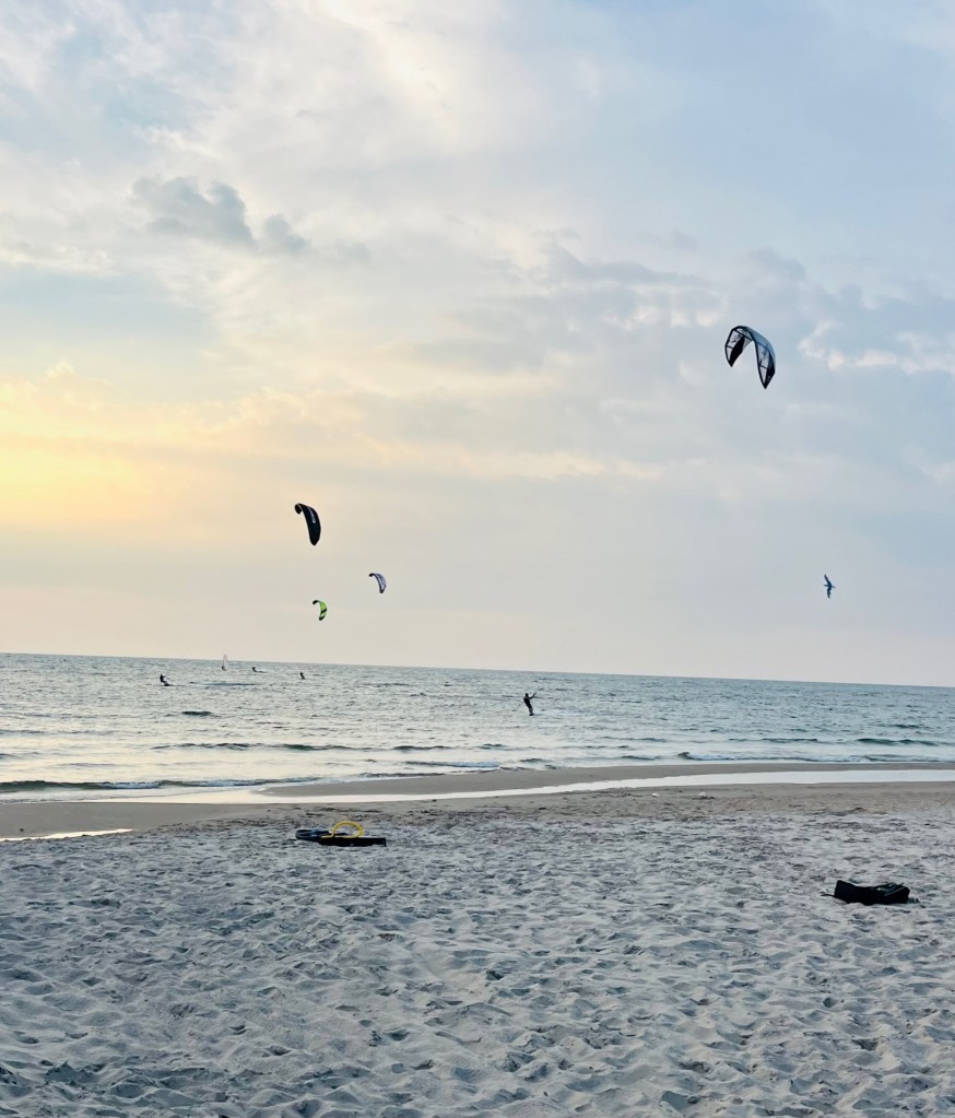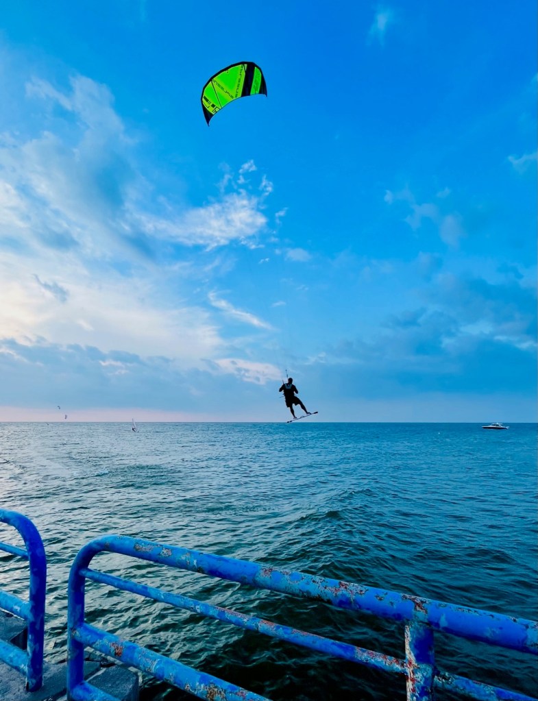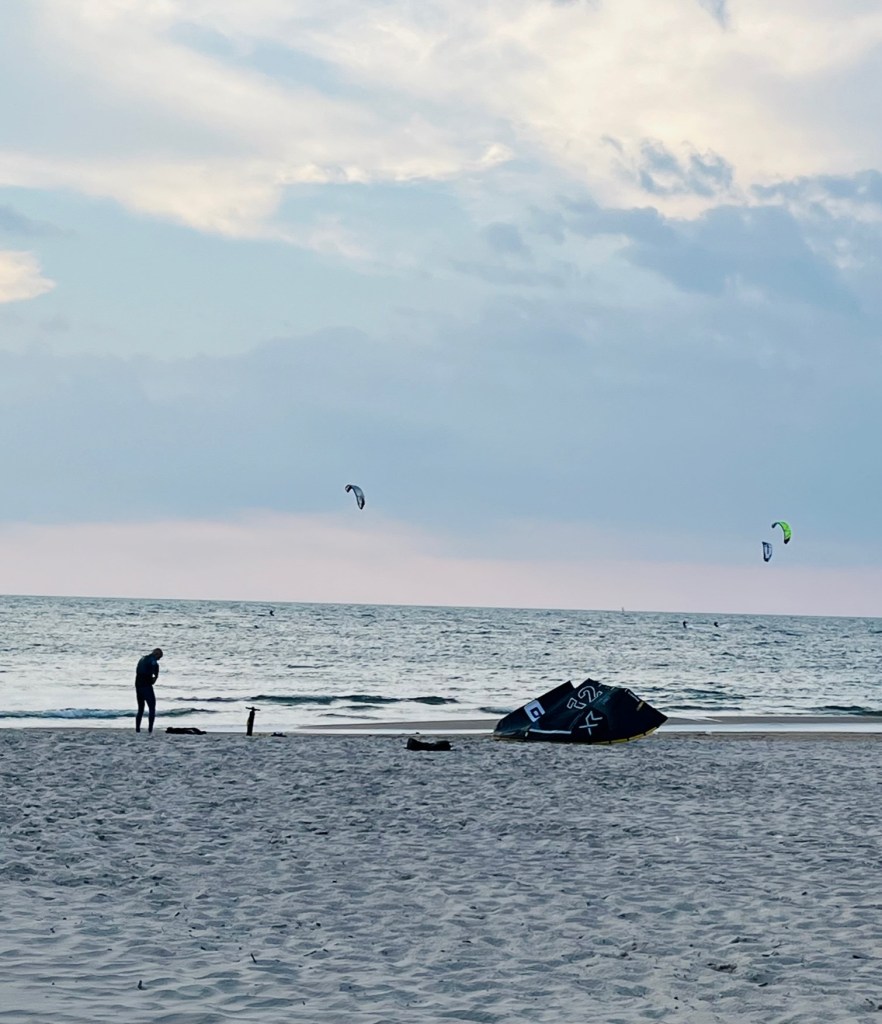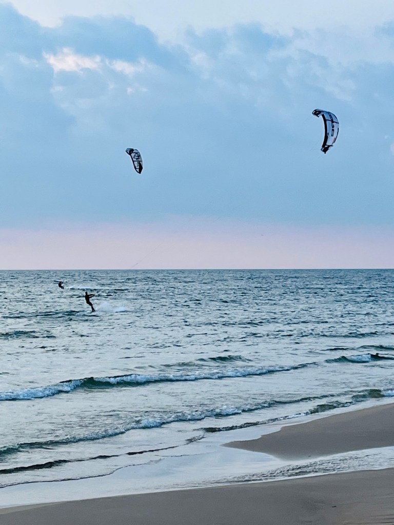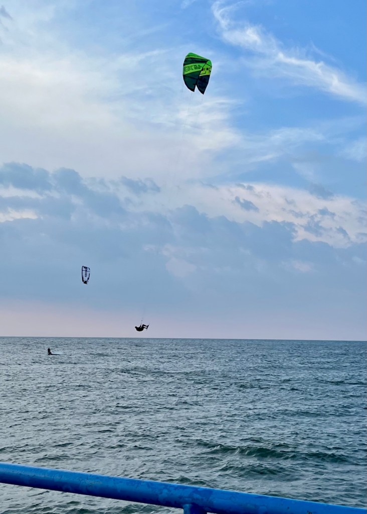 The next night the wind subsides. We walk up to the pier and see many kite surfers.