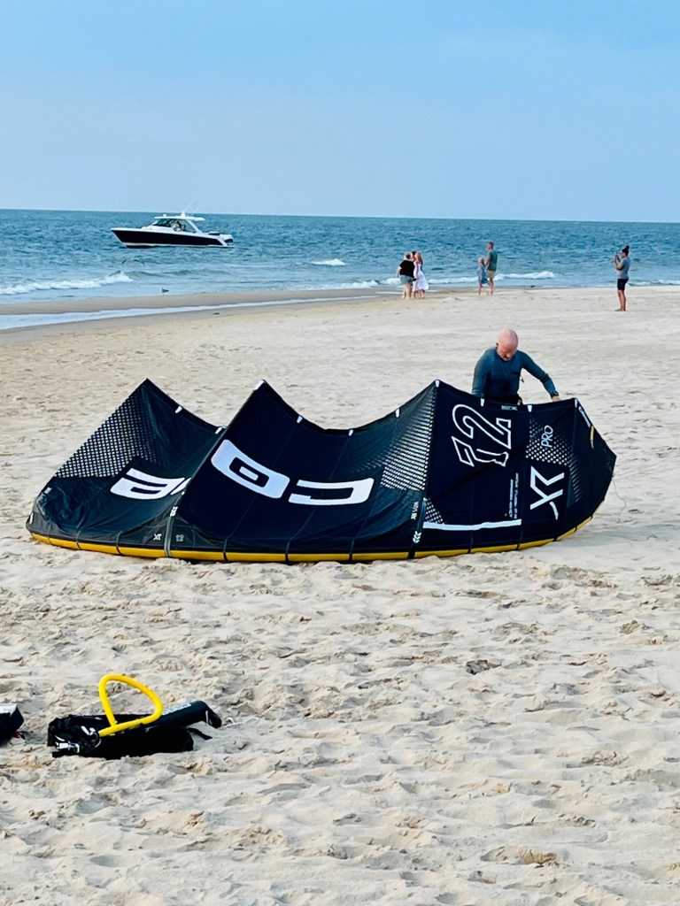 I have never seen kite surfers in action. We watch one surfer prepare his equipment to make his launch into the water.