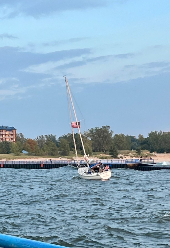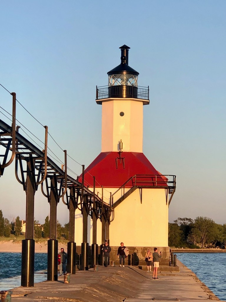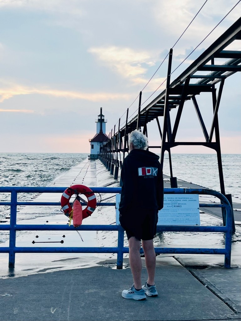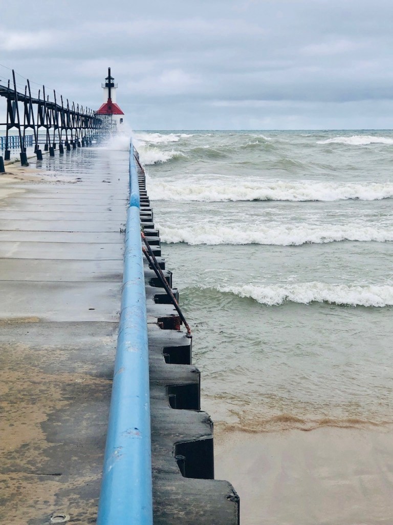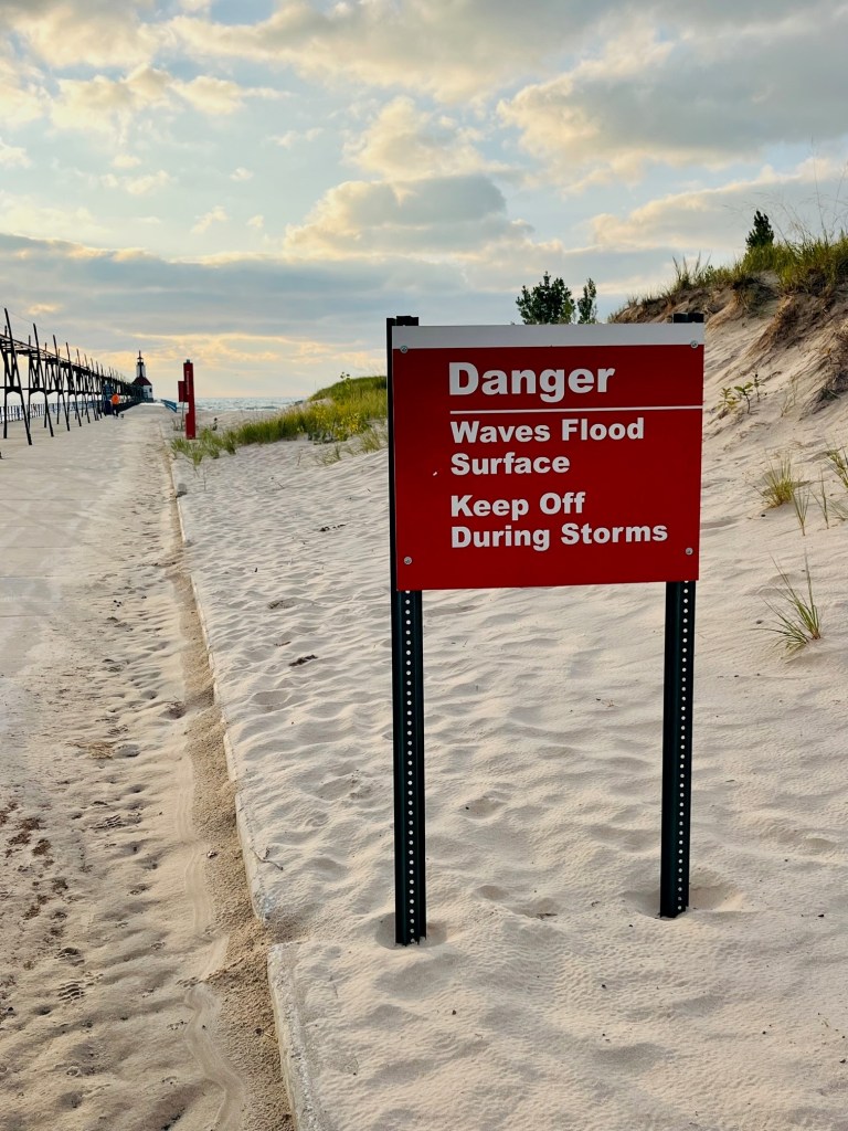 The marina manager warns us of the dangers of walking the lighthouse boardwalk. Many non-vigilant visitors have underestimated the dangers of Lake Michigan.