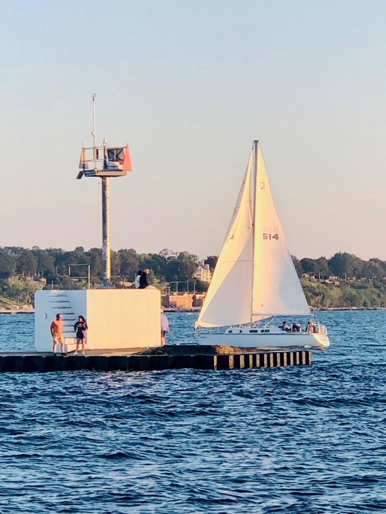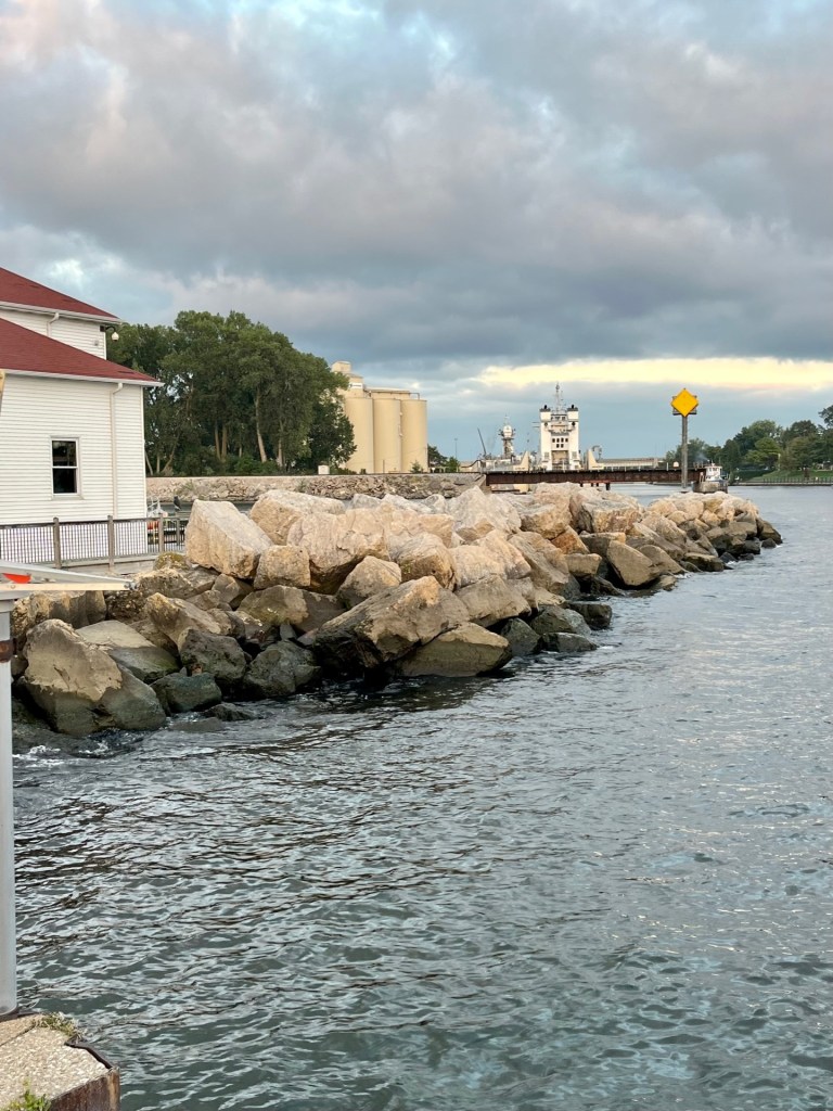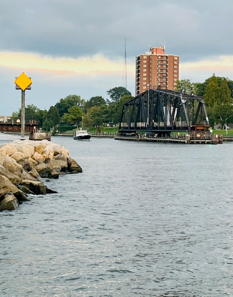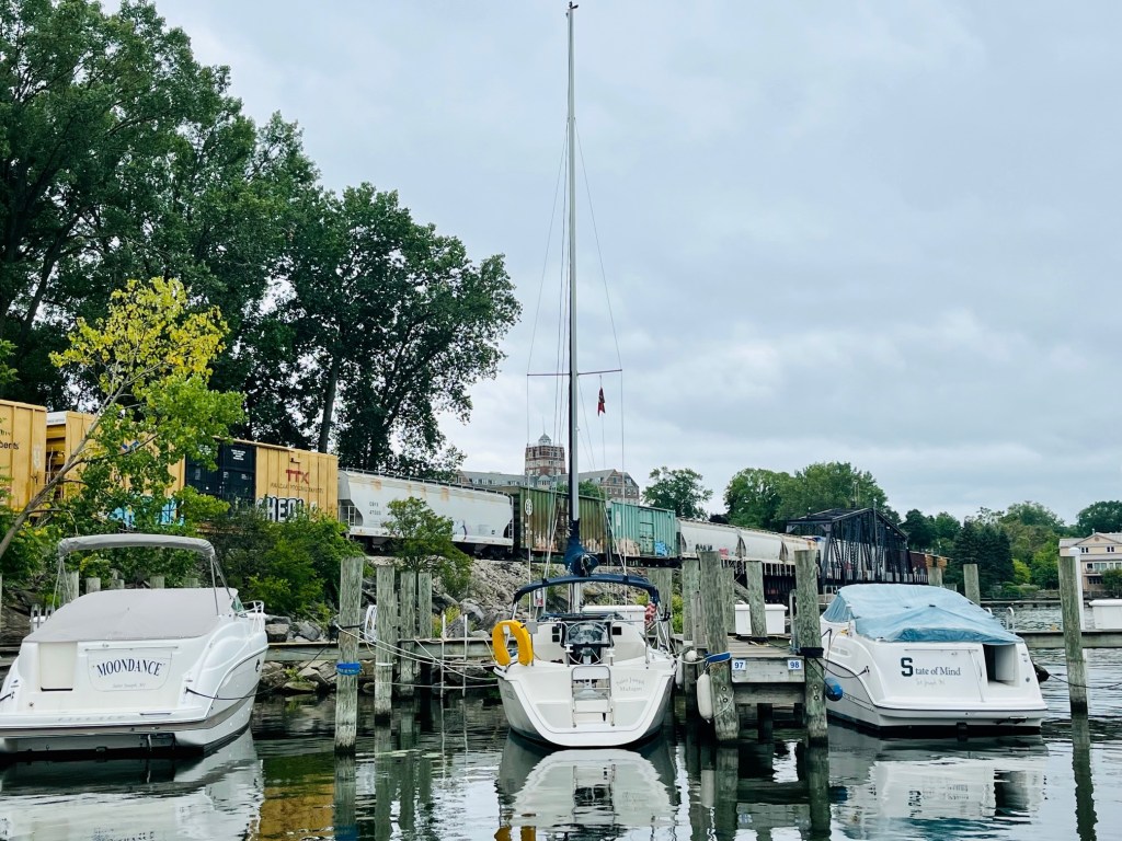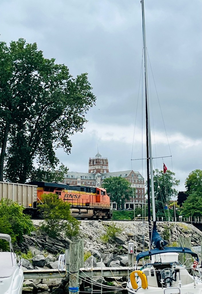 Marinas have distinctive sounds – squawking Canadian geese; seagulls screeching; clip clop of horse hooves in Mackinac; whistling from sail masts; buoy balls banging on docks. This marina has a first though – “clickety clack clack” and whistling – from a train! The marina is adjacent to a train track that carries aggregates and commodities. We watch the boxcars whiz by in both directions.