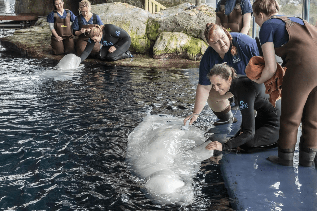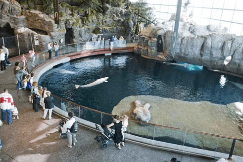 By the sea otter exhibit is a large natural looking touch tank for tide pool creatures like crabs, sea cucumbers and sea anemones. The lower level of the Oceanarium allows underwater viewing of the beluga whales and the dolphins.The beluga whale is an Arctic and sub-Arctic cetacean, white in color, and often called “white whales.”