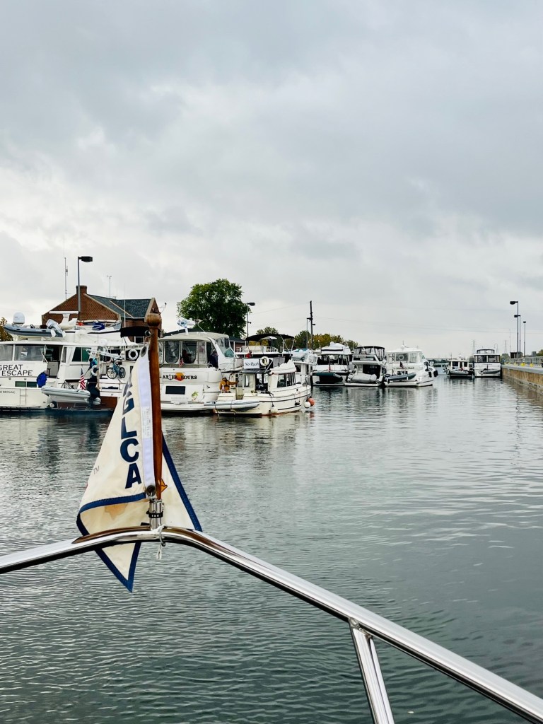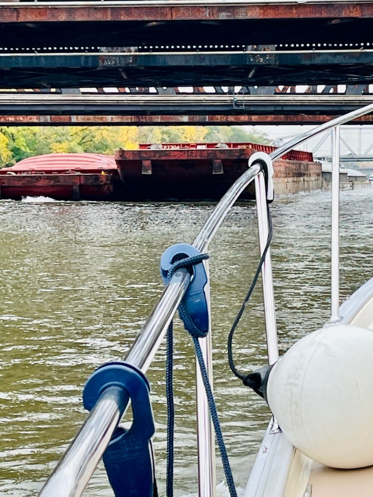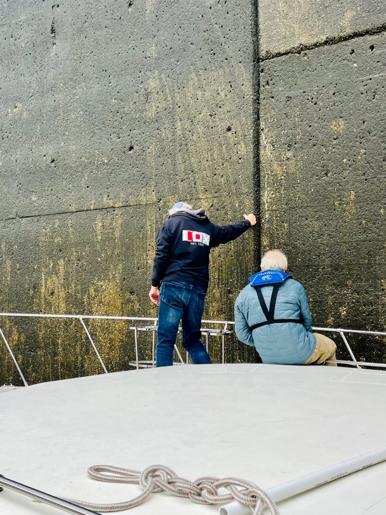 As we approach the lock the lockmaster announces there are fewer “pins” on the walls. These are where a boat can attach itself on the wall. The larger boats go into the lock, with the smaller boats rafting up. As a boat enters the lock, it will radio a boat and ask permission to raft aside it.