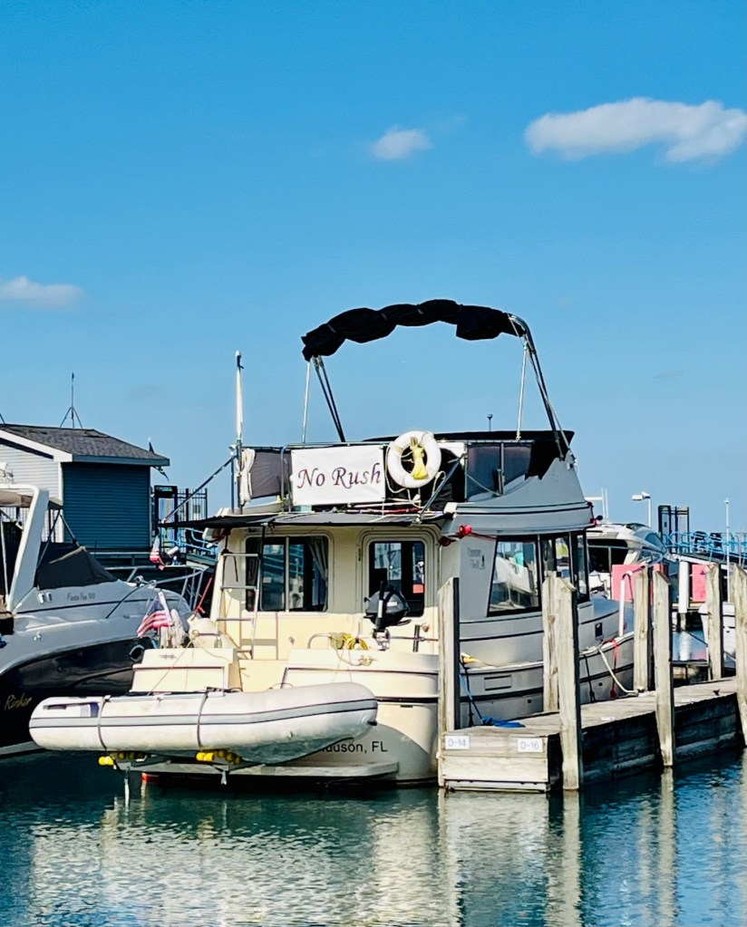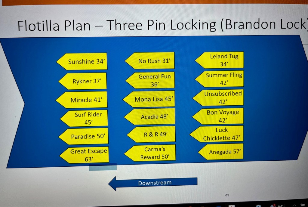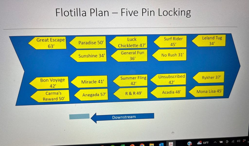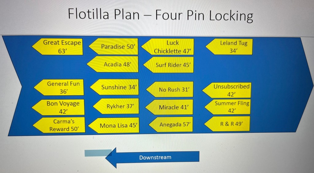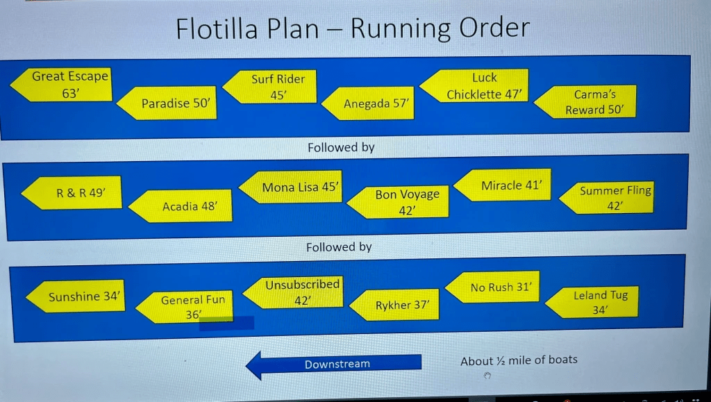 We have 18 boats in our Flotilla. Our Flotilla Leader, John Parks, communicates to the group via a Zoom meeting the Wednesday night before our departure. We are impressed by his organization. He sends everyone a PowerPoint presentation with instructions complete with diagrams. Someone expressed “it’s like a military operation!”