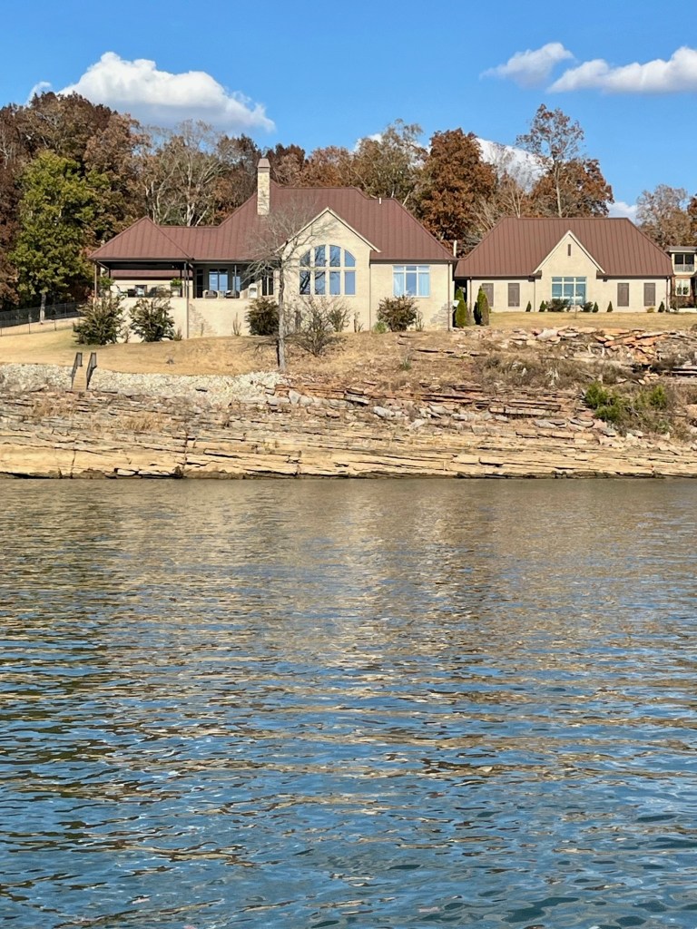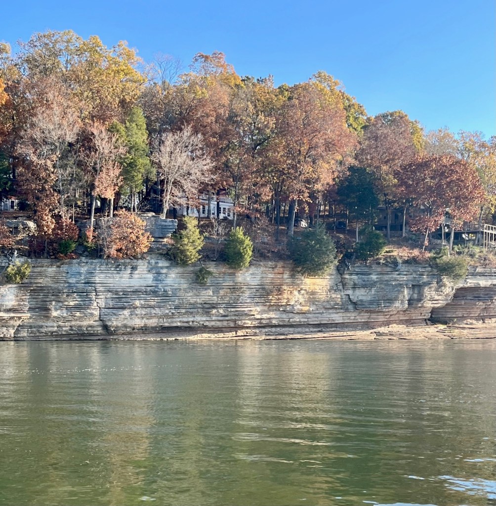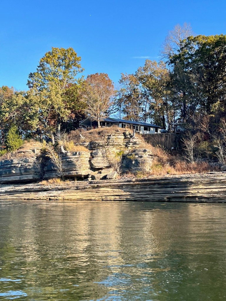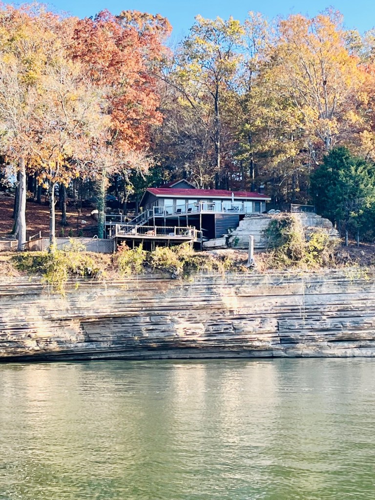 Once again, Kentucky Lake proves to be magnificent -homes on stilts, stately mansions, autumn foliage and stony cliffs climbing the shoreline. We are in an area called “Bath Springs.”