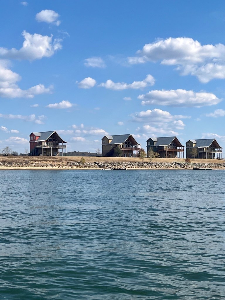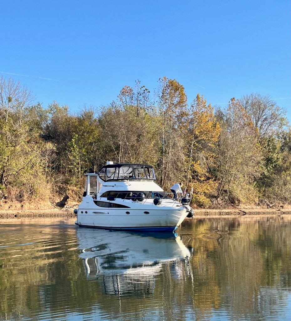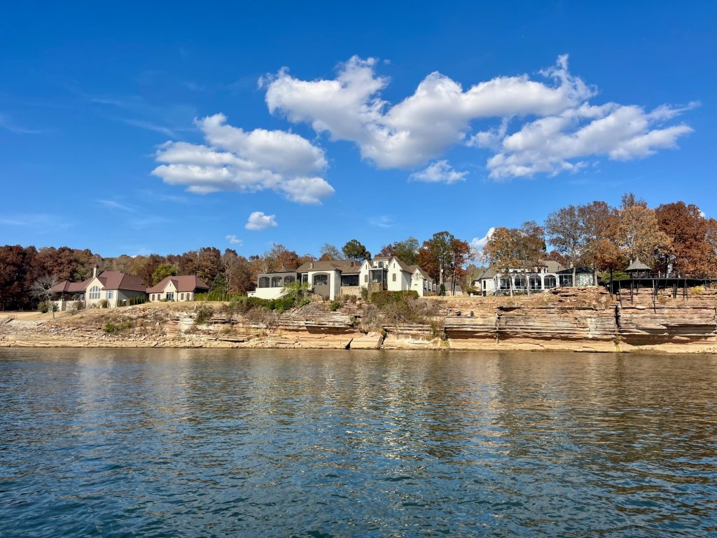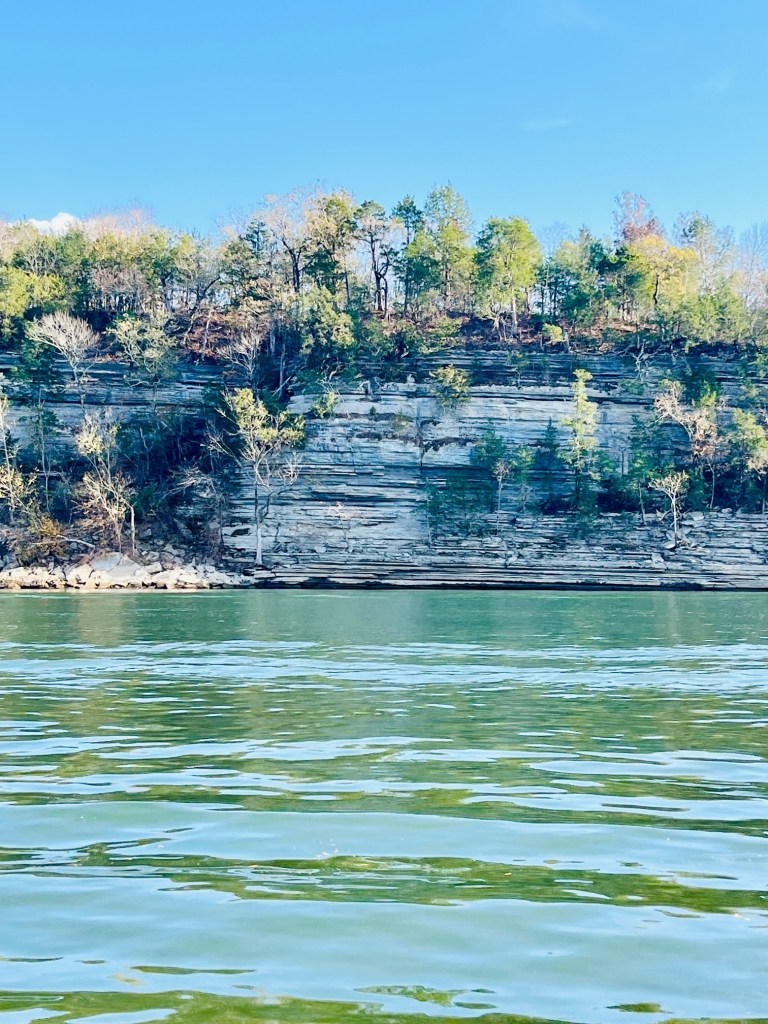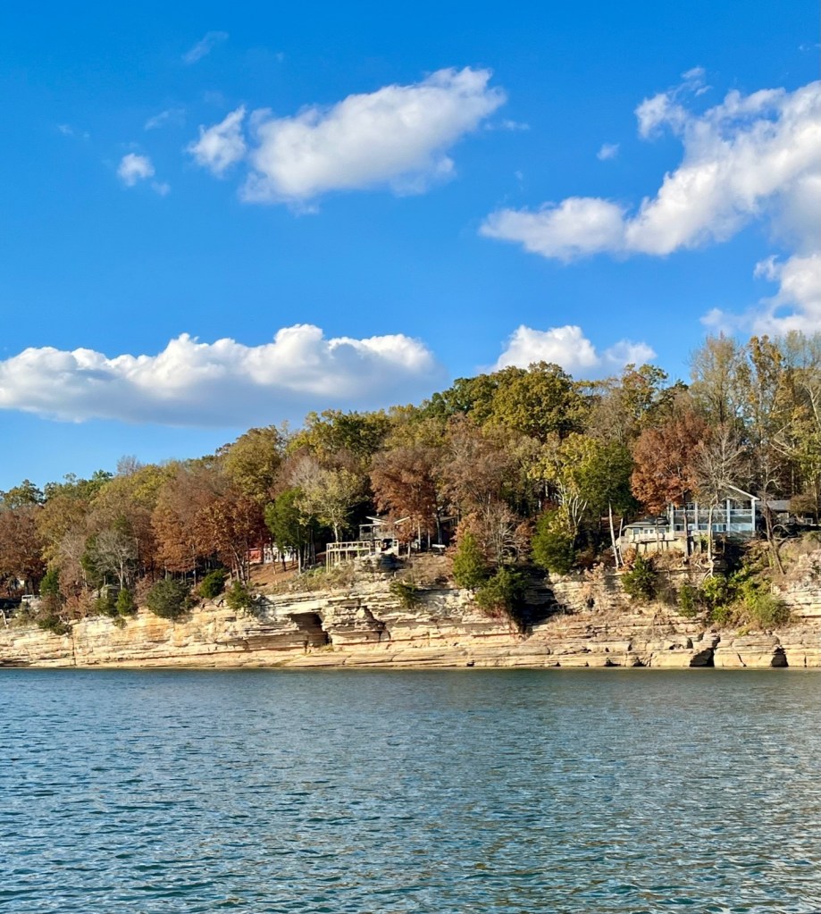 Once again, Kentucky Lake proves to be magnificent -homes on stilts, stately mansions, autumn foliage and stony cliffs climbing the shoreline. We are in an area called “Bath Springs.”