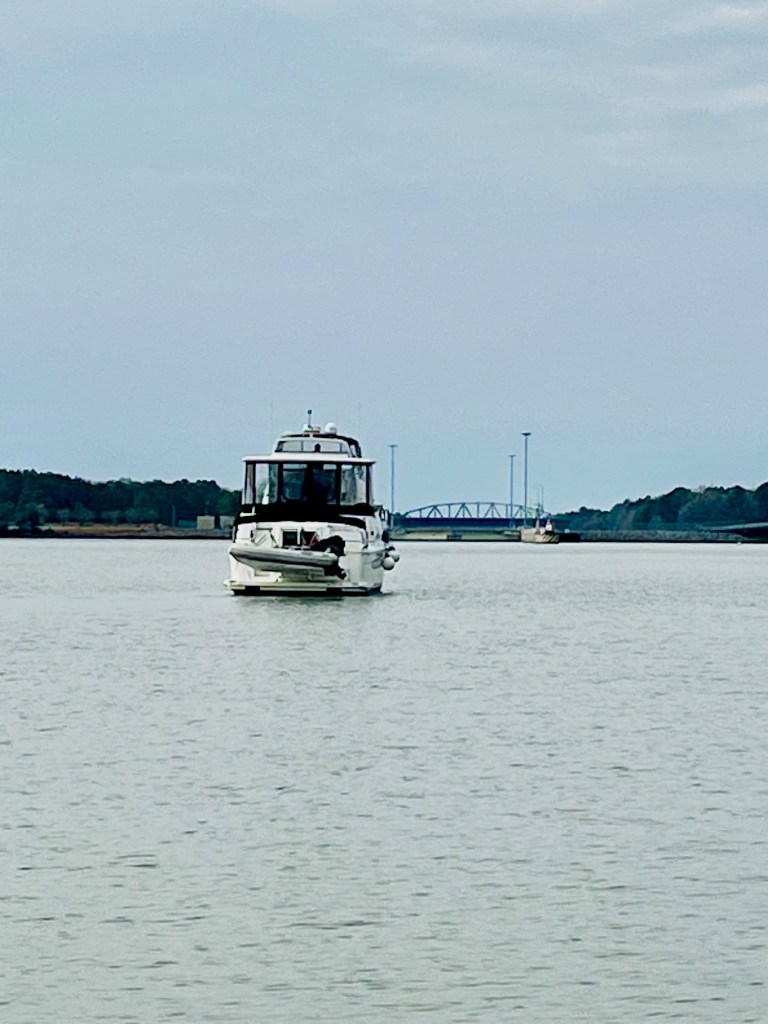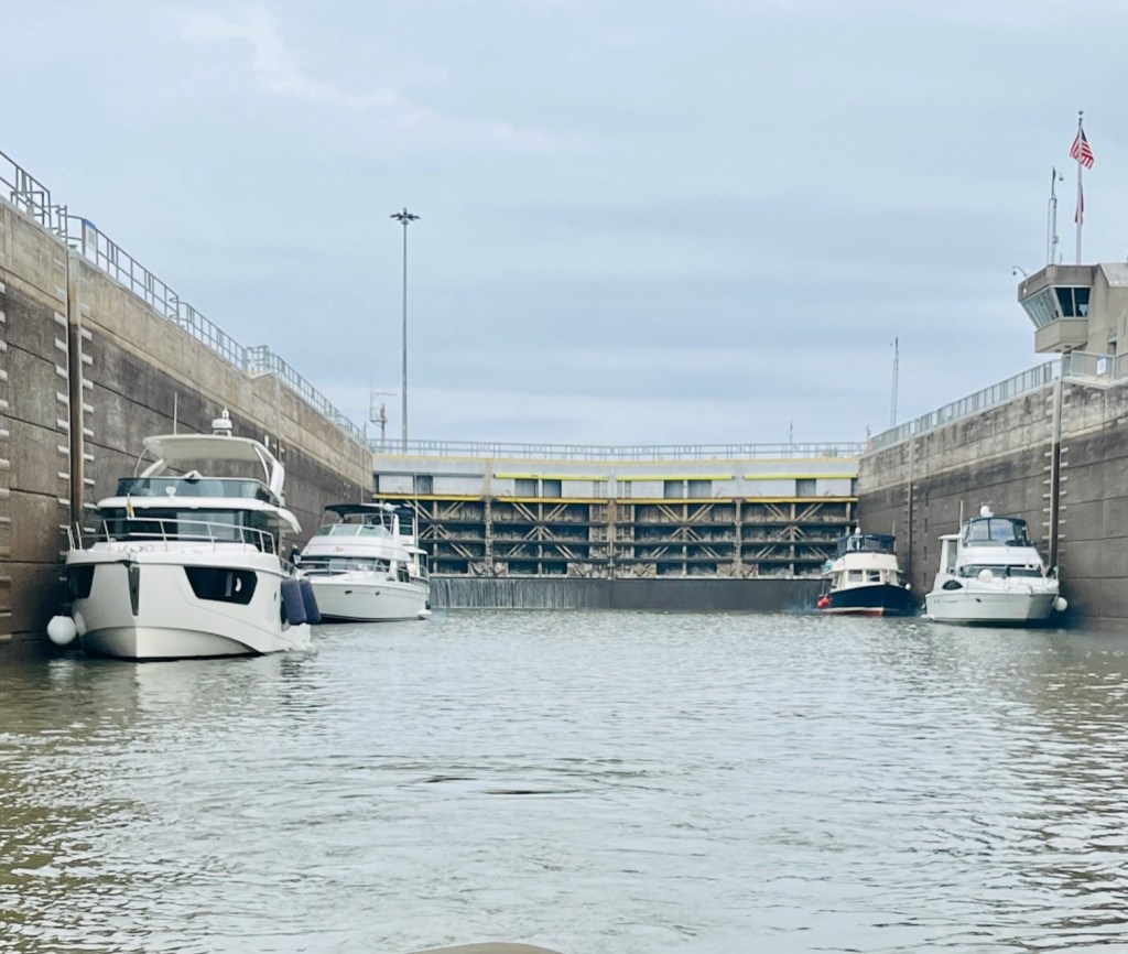 Approaching the third lock – Amory – we hear there will be a delay. The boats go into a holding pattern, waiting for the lock to open. Someone starts a trivia game over the radio with “Name that Tune.” This is short lived.