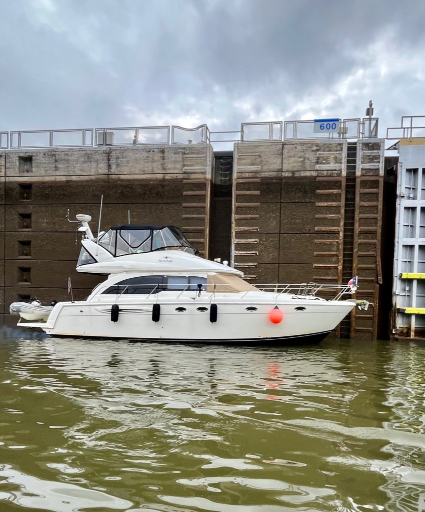 It gets frantic, as a barge is exiting the lock and into the channel, where all our boats are. Tracy manages to get Done Saving out of the way.