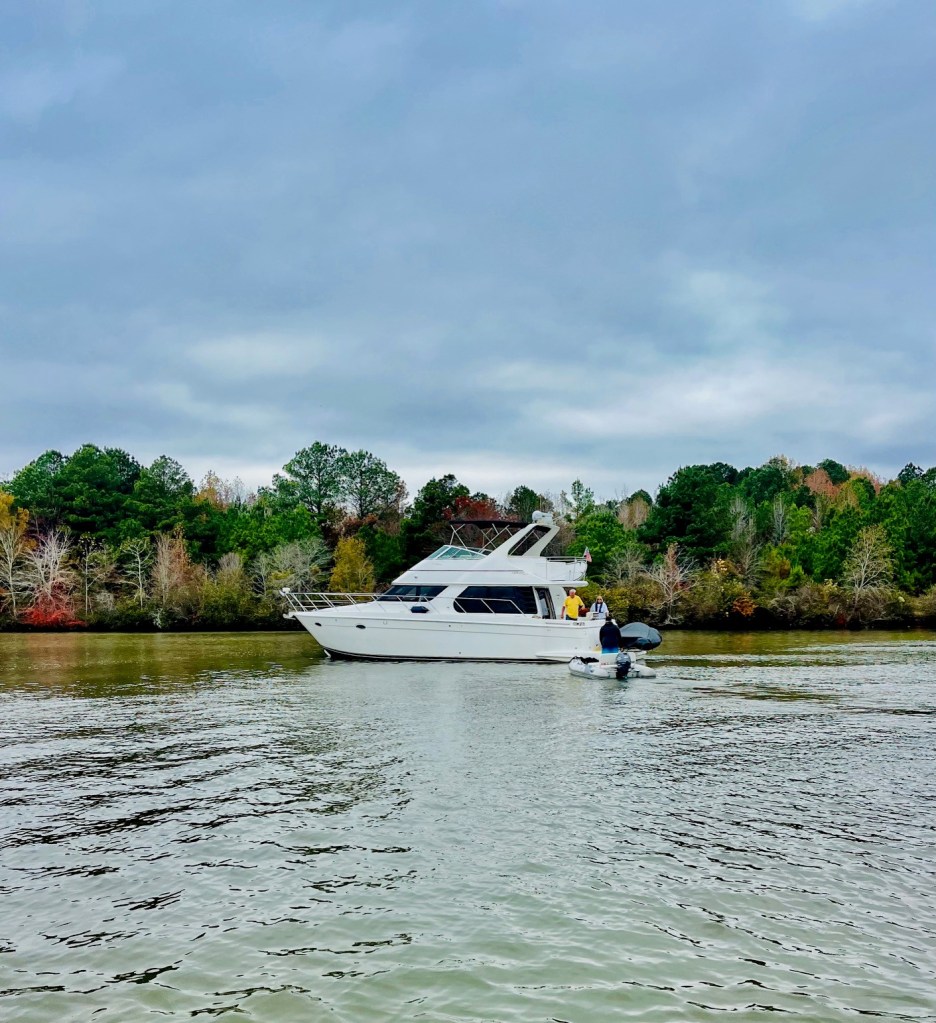 George, on his dinghy, brings a line from his boat to Captain Pat. Minutes later, Done Saving is back in business. Tracy takes over the helm, and George brings a line to Gryffin Joy and back to Pat.