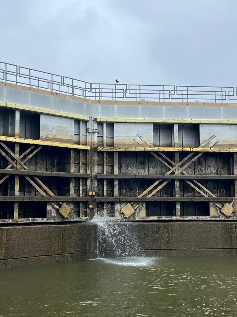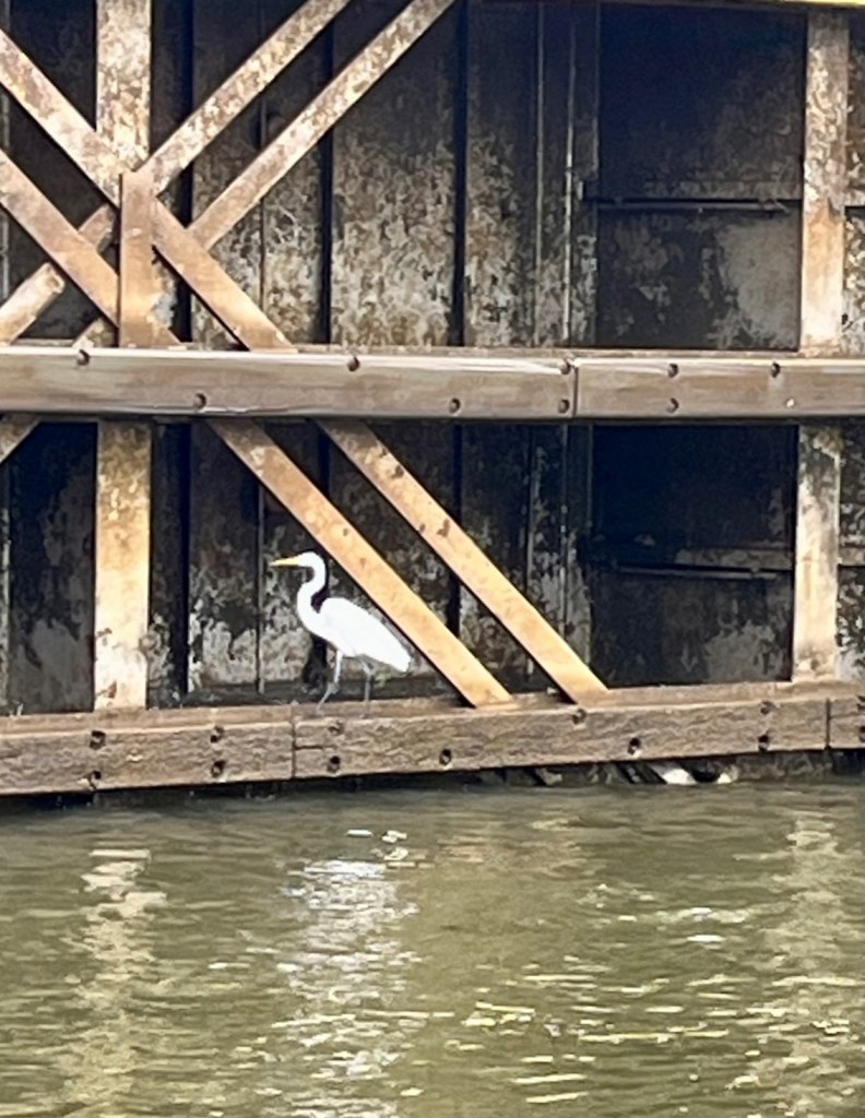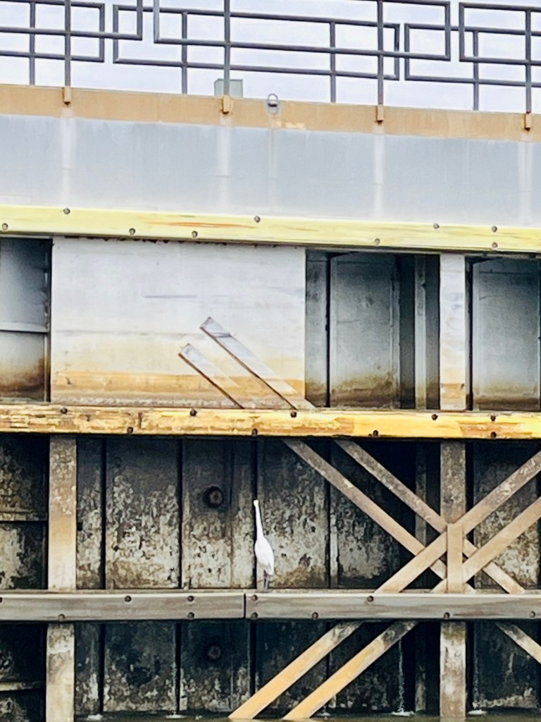 Finally, we enter our first lock – Stennis. A white crane nestles inside the gate.