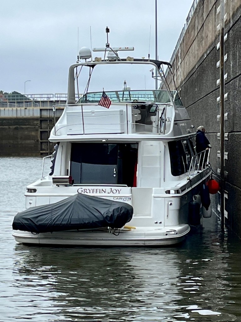 The boat Hunky Dory enters the lock with us. Tom and Lisa are traveling the Loop on their C-Dory with their 11-year-old Golden doodle, Miss Cocoa. She seems so well behaved to me; but Cocoa’s owners tell me she has been known to pee on their bed, especially if they leave her.