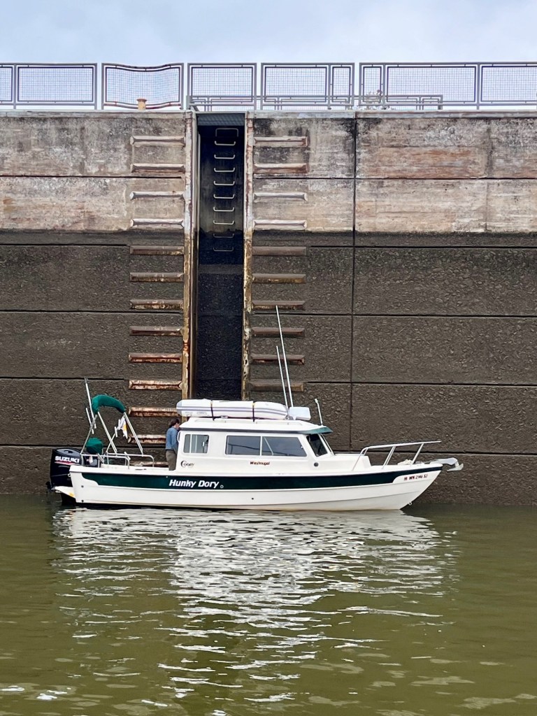After secured in the lock Melanie radios to the Lockmaster: “Drop us quick! We need daylight to anchor in!”