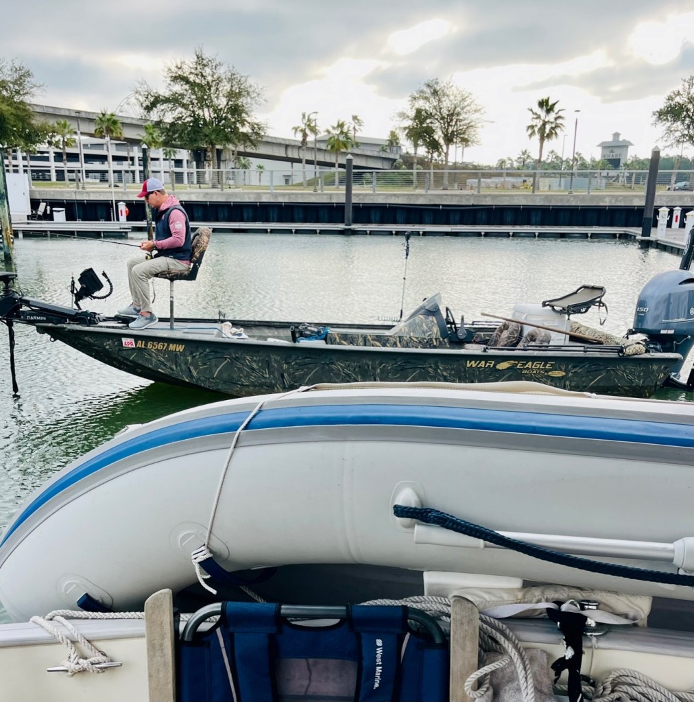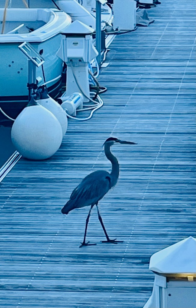 This is a first. Pretty sure he is not supposed to be fishing near the marina slips.
