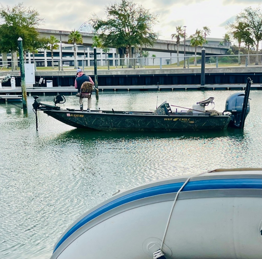 I walk out the boat door this morning and there is a fisherman in a camouflage boat. Right behind our boat!