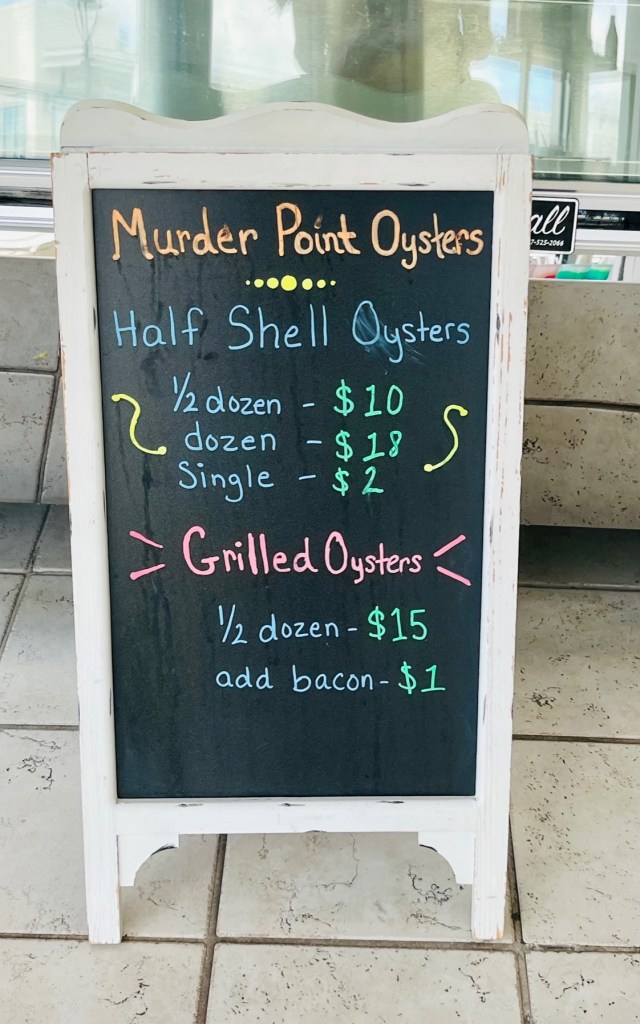I’m surprised he doesn’t want the oysters on display at Murder Point Oysters. He doesn’t like the price.
