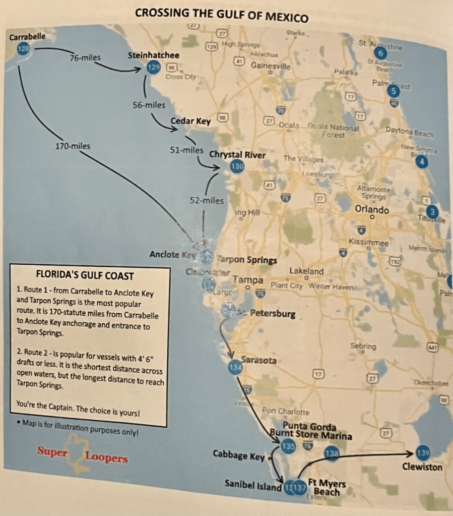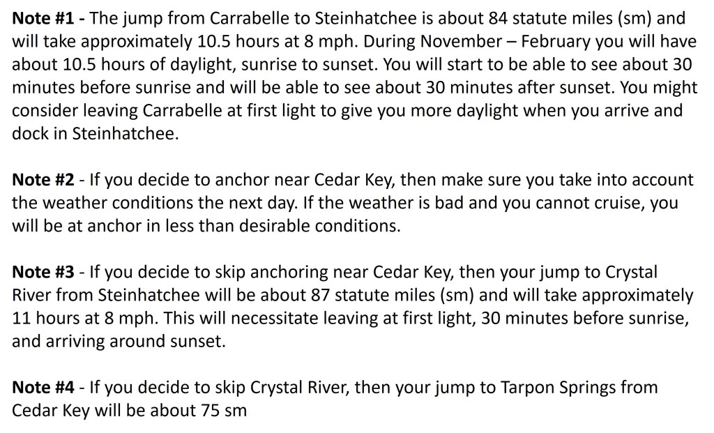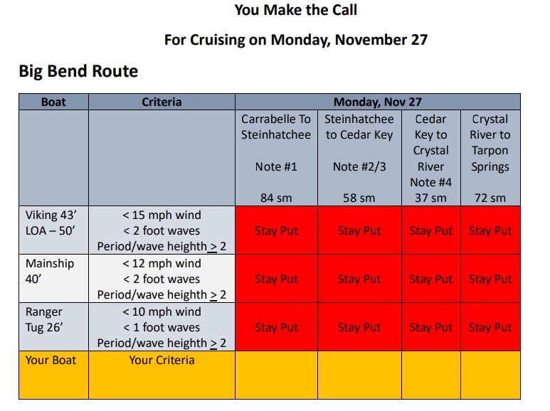 They then make their recommendation for crossing – should it be a daylight-only crossing, or a go-fast crossing from Carabelle to Tarpon Springs. Remember our map at the beginning of this post: