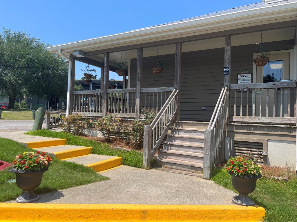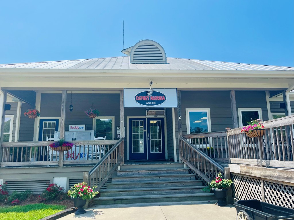 Tuesday, May 31, and Wednesday, June 1, we made Osprey Marina in Myrtle Beach our home base. This marina reminded me of Kentucky. It’s tucked away in a country setting with flowers, pine trees, and rocking chairs on the porch. And supposedly alligators, although we never saw one. Just some hungry turtles. One evening we fed one turtle who stuck his head up by the boat, looking up at us. The next morning we had three turtles!