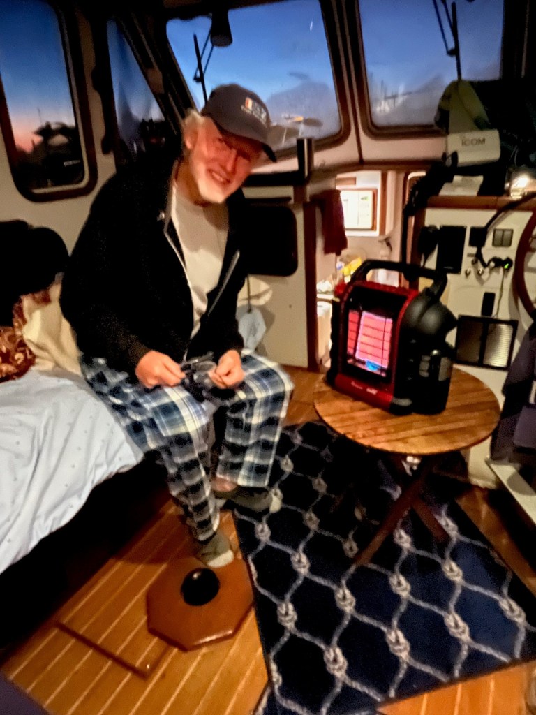 It is so cold. We keep the windows and doors open so the interior windows do not fog up and Captain Pat has some visibility. The hatches are leaking. Bowls are everywhere to catch the water.