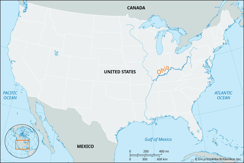 The Ohio River is navigable and originates in Pittsburgh, Pennsylvania Mile 0 ad ends at Cairo, Illinois Mile 981 at which point it flows into the Mississippi River.